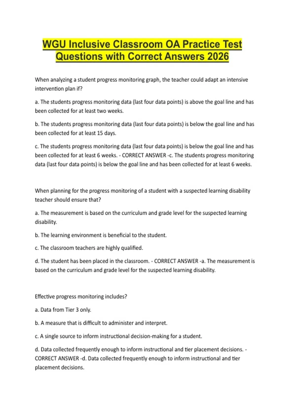 WGU Inclusive Classroom OA Practice Test Questions with Correct Answers 2026