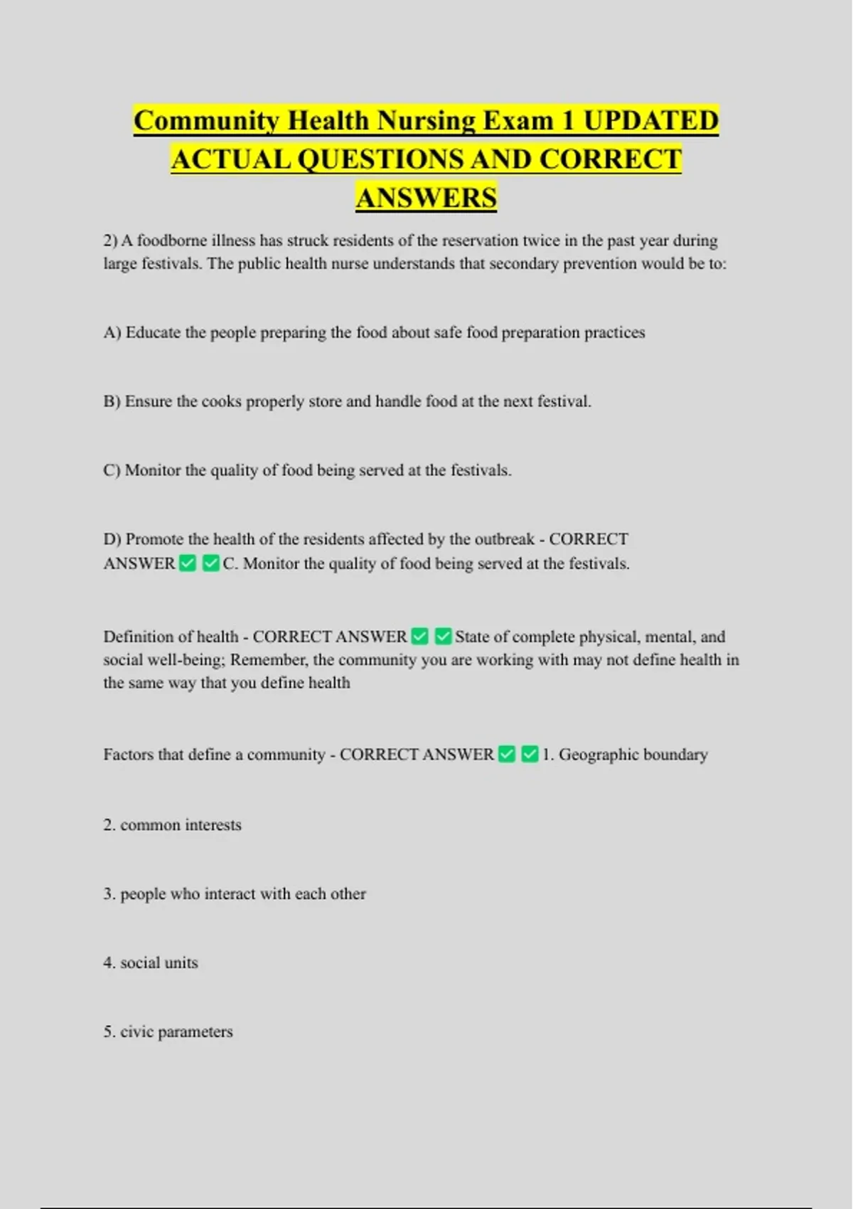 Community Health Nursing Exam 1 UPDATED ACTUAL QUESTIONS AND CORRECT ANSWERS 2) A foodborne illness has struck residents of the reservation twice in the past year during large festivals. The public health nurse understands that secondary prevention would be to: A) Educate the people preparing the food about safe food preparation practices B) Ensure the cooks properly store and handle food at the next festival. C) Monitor the quality of food being served at the festivals. D) Promote the health of the residents affected by the outbreak - CORRECT ANSWER C. Monitor the quality of food being served at the festivals. Definition of health - CORRECT ANSWER State of complete physical, mental, and social well-being; Remember, the community you are working with may not define health in the same way that you define health Factors that define a community - CORRECT ANSWER 2. common interests 3. people who interact with each other 4. social units 5. civic parameters 1. Geographic boundary 6. Common beliefs/goals What is detrimental to health? - CORRECT ANSWER * Economic conditions * Social and environmental and cultural practices * Disease * Death * Disability * Lack of health care access