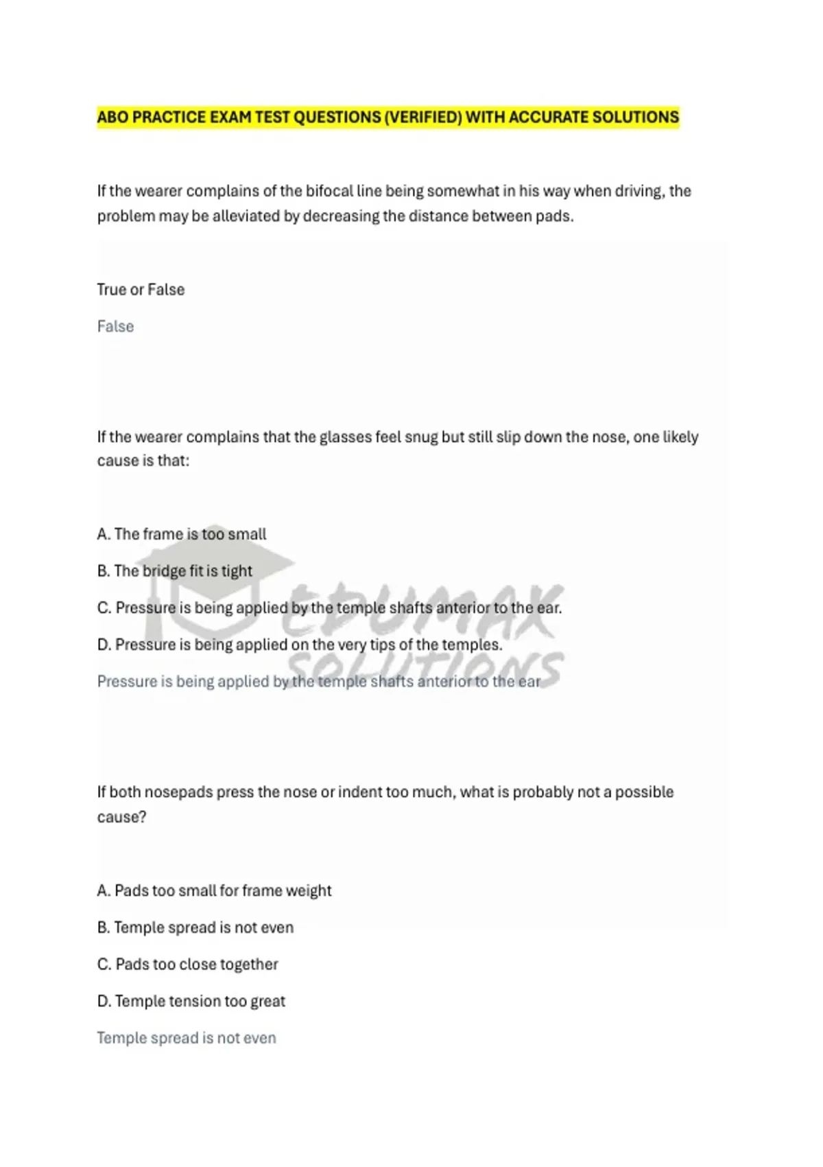 ABO PRACTICE EXAM TEST QUESTIONS (VERIFIED) WITH ACCURATE SOLUTIONS