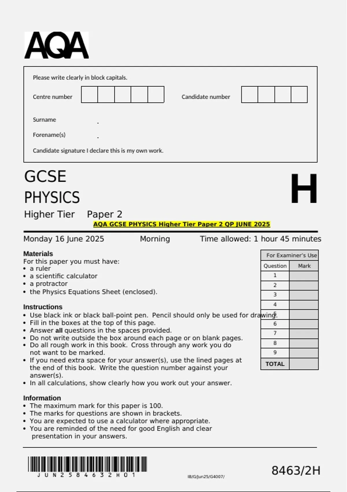 AQA GCSE PHYSICS Higher Tier Paper 2 QP JUNE 2025