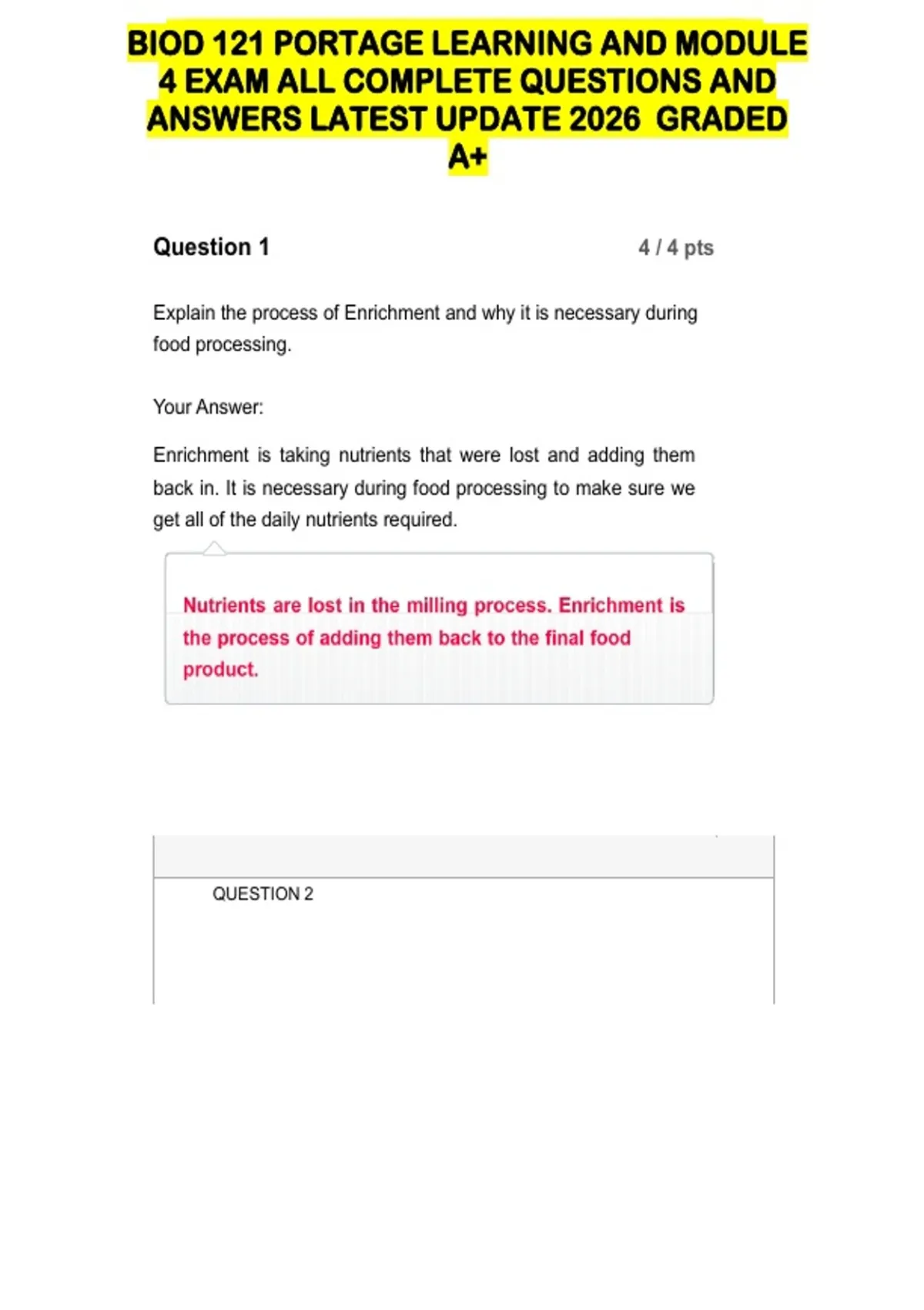 BIOD 121 PORTAGE LEARNING AND MODULE 4 EXAM ALL COMPLETE QUESTIONS AND ANSWERS LATEST UPDATE 2026 GRADED A+ Question 1 4 / 4 pts Explain the process of Enrichment and why it is necessary during food processing. Your Answer: Enrichment is taking nutrients that were lost and adding them back in. It is necessary during food processing to make sure we get all of the daily nutrients required.