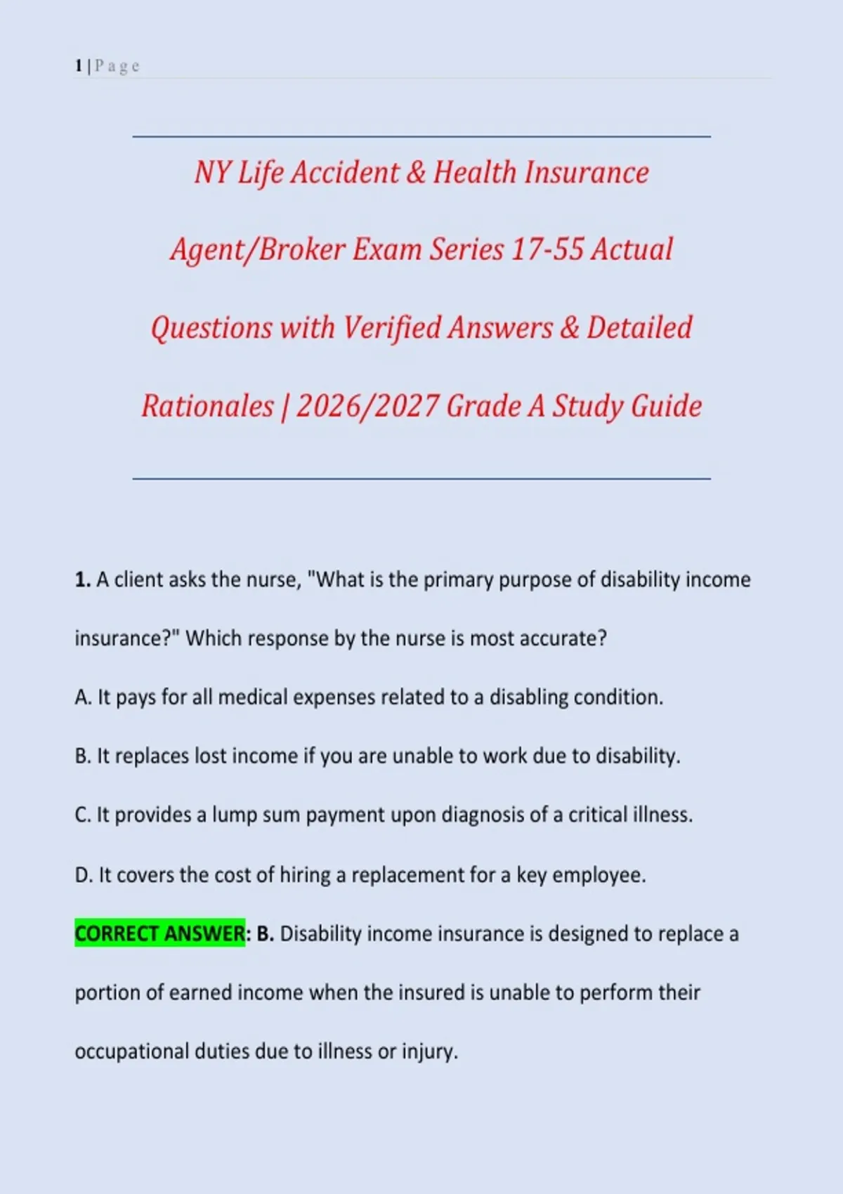 This comprehensive study guide is designed for candidates preparing for the New York Life, Accident & Health Insurance Agent/Broker Exam (Series 17-55). It features exam-aligned, actual-style questions with verified answers and detailed rationales, reflecting current New York licensing standards and exam requirements for the 2026/2027 testing cycle. Ideal for aspiring insurance agents, brokers, and licensing candidates in New York, this resource covers key exam domains including life insurance policies, accident and health coverage, annuities, underwriting principles, policy provisions, ethics, consumer protection, and New York insurance laws and regulations. Each question is supported by clear explanations to strengthen comprehension, application, and exam readiness. Aligned with the current Series 17-55 exam format, this study guide supports focused review, confidence-building, and first-attempt success. It is an essential tool for structured preparation and achieving Grade A performance on the NY Life, Accident & Health Insurance Agent/Broker Exam.