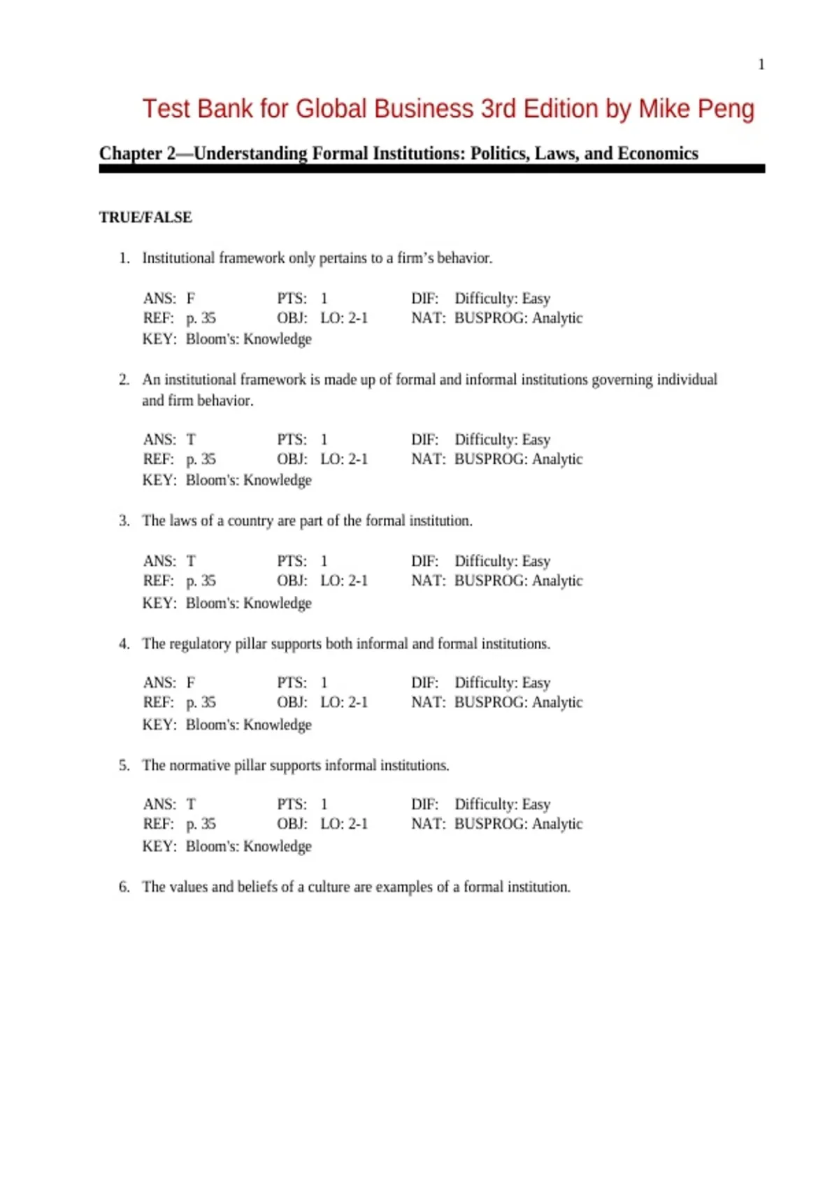 Test Bank for Global Business 3rd Edition by Mike Peng Chapter 2—Understanding Formal Institutions: Politics, Laws, and Economics TRUE/FALSE 1. Institutional framework only pertains to a firm’s behavior. ANS: F PTS: 1 DIF: Difficulty: Easy REF: p. 35 OBJ: LO: 2-1 NAT: BUSPROG: Analytic KEY: Bloom's: Knowledge 2. An institutional framework is made up of formal and informal institutions governing individual and firm behavior. ANS: T PTS: 1 DIF: Difficulty: Easy REF: p. 35 OBJ: LO: 2-1 NAT: BUSPROG: Analytic KEY: Bloom's: Knowledge 3. The laws of a country are part of the formal institution. ANS: T PTS: 1 DIF: Difficulty: Easy REF: p. 35 OBJ: LO: 2-1 NAT: BUSPROG: Analytic KEY: Bloom's: Knowledge 4. The regulatory pillar supports both informal and formal institutions. ANS: F PTS: 1 DIF: Difficulty: Easy REF: p. 35 OBJ: LO: 2-1 NAT: BUSPROG: Analytic KEY: Bloom's: Knowledge 5. The normative pillar supports informal institutions. ANS: T PTS: 1 DIF: Difficulty: Easy REF: p. 35 OBJ: LO: 2-1 NAT: BUSPROG: Analytic KEY: Bloom's: Knowledge 6. The values and beliefs of a culture are examples of a formal institution. ANS: F PTS: 1 DIF: Difficulty: Easy REF: p. 35 OBJ: LO: 2-1 NAT: BUSPROG: Analytic KEY: Bloom's: Knowledge 7. Cognitive pillar is the coercive power of governments. ANS: F PTS: 1 DIF: Difficulty: Easy REF: p. 36 OBJ: LO: 2-1 NAT: BUSPROG: Analytic KEY: Bloom's: Knowledge 8. Force majeure is a method of interpreting a statute by understanding the legislative history leading up to the adoption of that statute. ANS: F PTS: 1 DIF: Difficulty: Easy REF: p. 36 OBJ: LO: 2-2 NAT: BUSPROG: Analytic KEY: Bloom's: Knowledge 9. Disabling formal institutes does not affect transaction costs. ANS: F PTS: 1 DIF: Difficulty: Easy REF: p. 37 OBJ: LO: 2-2 NAT: BUSPROG: Analytic KEY: Bloom's: Knowledge 10. Opportunism increases transaction costs. ANS: T PTS: 1 DIF: Difficulty: Moderate REF: p. 38 OBJ: LO: 2-2 NAT: BUSPROG: Analytic KEY: Bloom's: Comprehension 11. Transitional economies have static institutions. ANS: F PTS: 1 DIF: Difficulty: Moderate REF: p. 38 OBJ: LO: 2-2 NAT: BUSPROG: Analytic KEY: Bloom's: Comprehension 12. According to the institution-based view, managers and firms make choices outside institutional constraints. ANS: F PTS: 1 DIF: Difficulty: Easy REF: p. 39 OBJ: LO: 2-3 NAT: BUSPROG: Analytic KEY: Bloom's: Knowledge 13. Proposition 1 of the institution-based view specifically concerns bounded rationality. ANS: T PTS: 1 DIF: Difficulty: Easy REF: p. 39 OBJ: LO: 2-3 NAT: BUSPROG: Diversity KEY: Bloom's: Knowledge 14. Economic systems are examples of formal institutions. ANS: T PTS: 1 DIF: Difficulty: Easy REF: p. 40 OBJ: LO: 2-3 NAT: BUSPROG: Analytic KEY: Bloom's: Knowledge 15. Right-wing totalitarianism refers to the monopolization of power in the hands of a communist party. ANS: F PTS: 1 DIF: Difficulty: Easy REF: p. 41 OBJ: LO: 2-4 NAT: BUSPROG: Analytic KEY: Bloom's: Knowledge 16. Theocratic totalitarianism refers to the monopolization of political power in the hands of one religious party. ANS: T PTS: 1 DIF: Difficulty: Easy REF: p. 41 OBJ: LO: 2-4 NAT: BUSPROG: Analytic KEY: Bloom's: Knowledge 17. Totalitarian countries have less political risk than democratic ones. ANS: F PTS: 1 DIF: Difficulty: Easy REF: p. 41 OBJ: LO: 2-4 NAT: BUSPROG: Analytic KEY: Bloom's: Knowledge 18. Firms operating in democracies never confront political risk. ANS: F PTS: 1 DIF: Difficulty: Easy REF: p. 41 OBJ: LO: 2-4 NAT: BUSPROG: Analytic KEY: Bloom's: Knowledge 19. Civil law uses comprehensive statutes and codes as a primary means to form legal judgments. ANS: T PTS: 1 DIF: Difficulty: Easy REF: p. 43 OBJ: LO: 2-5 NAT: BUSPROG: Analytic KEY: Bloom's: Knowledge 20. The common law tradition is mostly spread in non-English speaking countries. ANS: F PTS: 1 DIF: Difficulty: Easy REF: p. 43 OBJ: LO: 2-5 NAT: BUSPROG: Analytic KEY: Bloom's: Knowledge 21. Contracts in civil law countries tend to be long and detailed compared to contracts in common law countries. ANS: F PTS: 1 DIF: Difficulty: Easy REF: p. 44 OBJ: LO: 2-5 NAT: BUSPROG: Analytic KEY: Bloom's: Knowledge