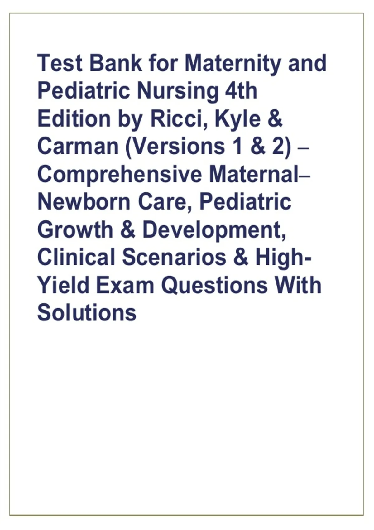 ___________ Te st Bank for Maternity and Pediat ric Nursing 4t h Edit ion by R icci, Kyle & Carman (Versions 1 & 2) – Comprehe nsive Maternal– New born Ca re, Pediatric Growt h & Devel opme nt, Clinical Scena rios & High-Yiel d Exam Que stions With Solutions!!!!!!!!!!!!!!!!!!