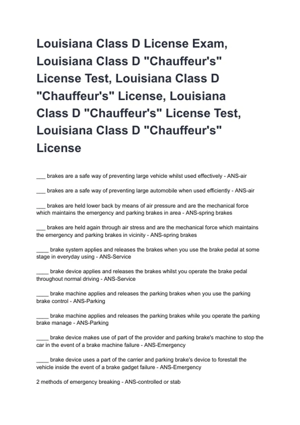Louisiana Class D License Exam, Louisiana Class D "Chauffeur's" License Test, Louisiana Class D "Chauffeur's" License, Louisiana Class D "Chauffeur's" License Test, Louisiana Class D "Chauffeur's" License NEWEST 2026/2027 ACTUAL EXAM COMPLETE QUESTIONS AND CORRECT DETAILED ANSWERS (VERIFIED ANSWERS) |ALREADY GRADED A+||BRAND NEW!!