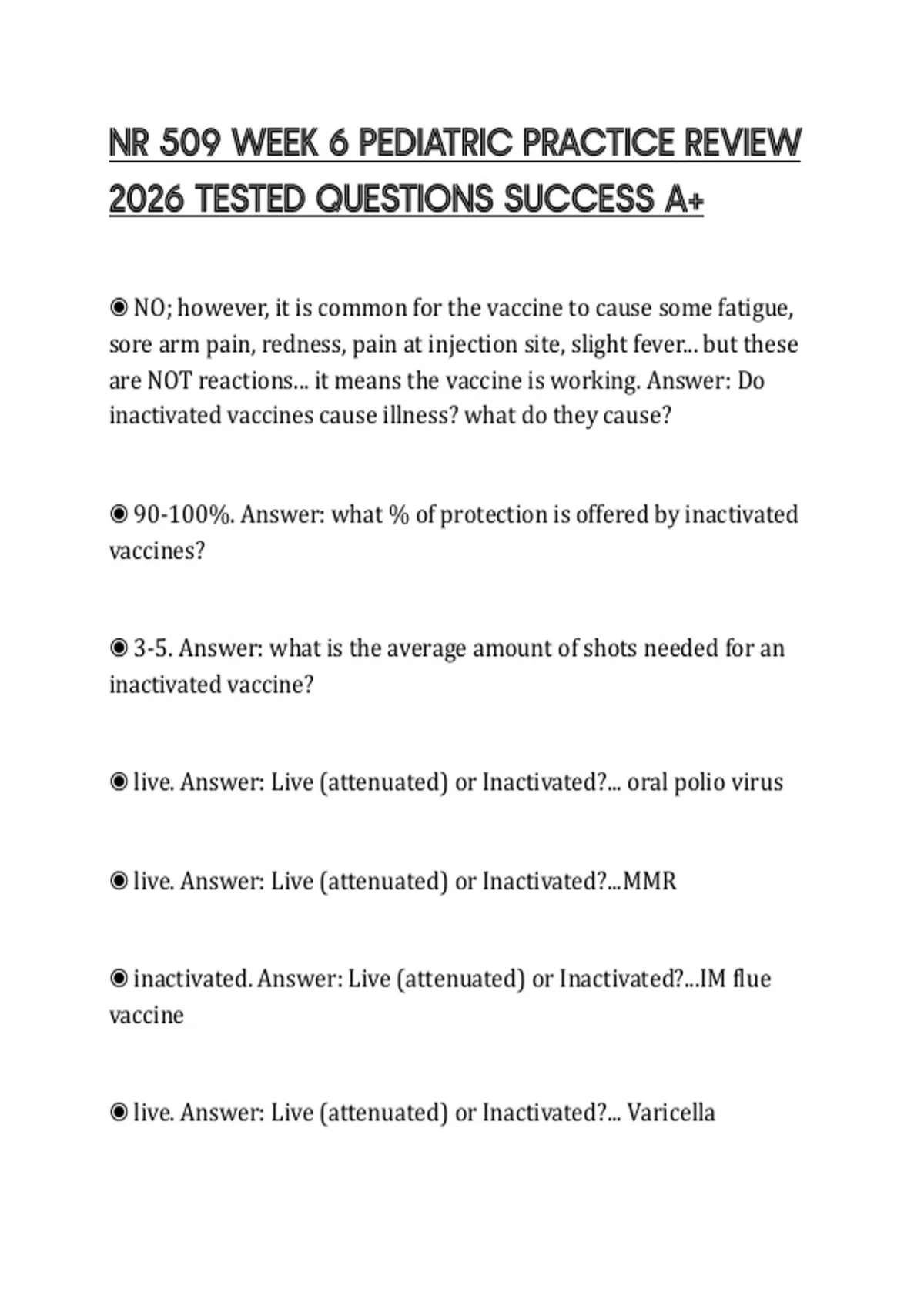 NR 509 WEEK 6 PEDIATRIC PRACTICE REVIEW 2026 TESTED QUESTIONS SUCCESS A+