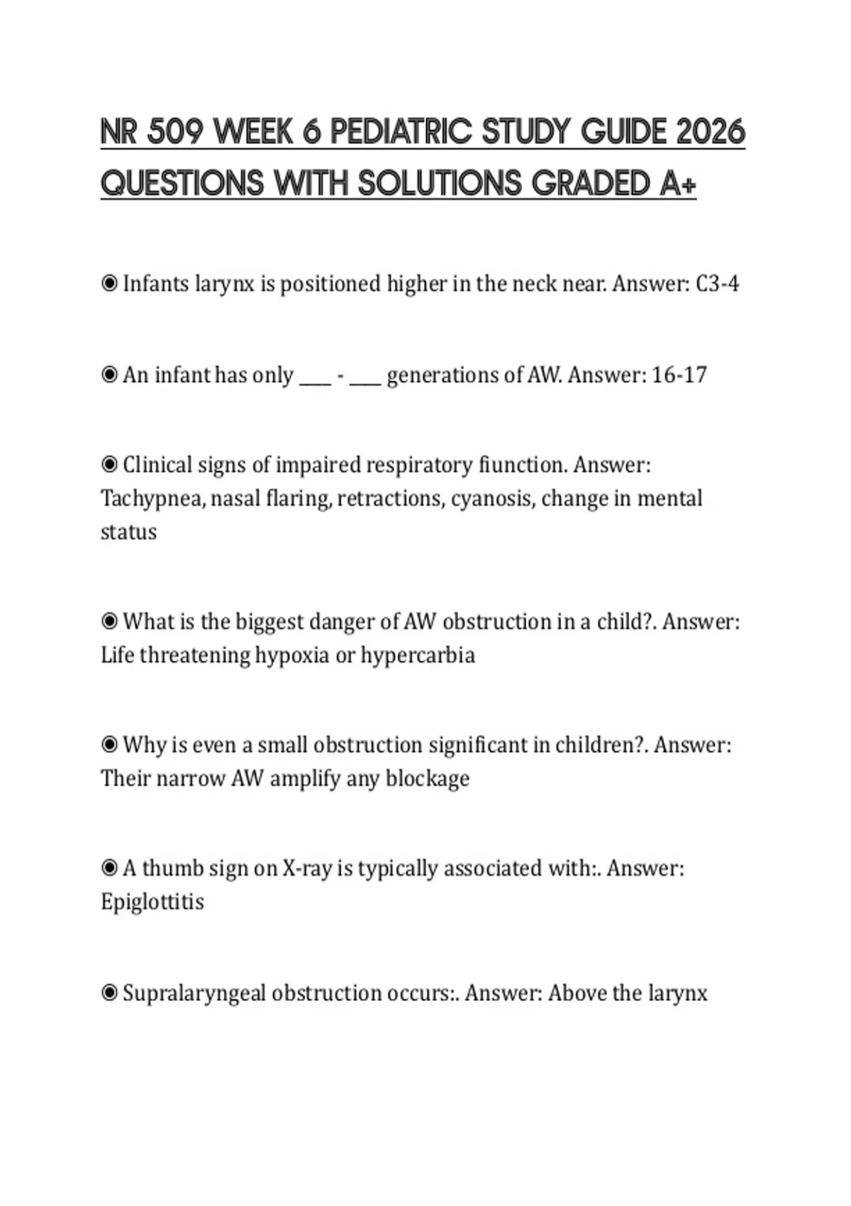 NR 509 WEEK 6 PEDIATRIC STUDY GUIDE 2026 QUESTIONS WITH SOLUTIONS GRADED A+