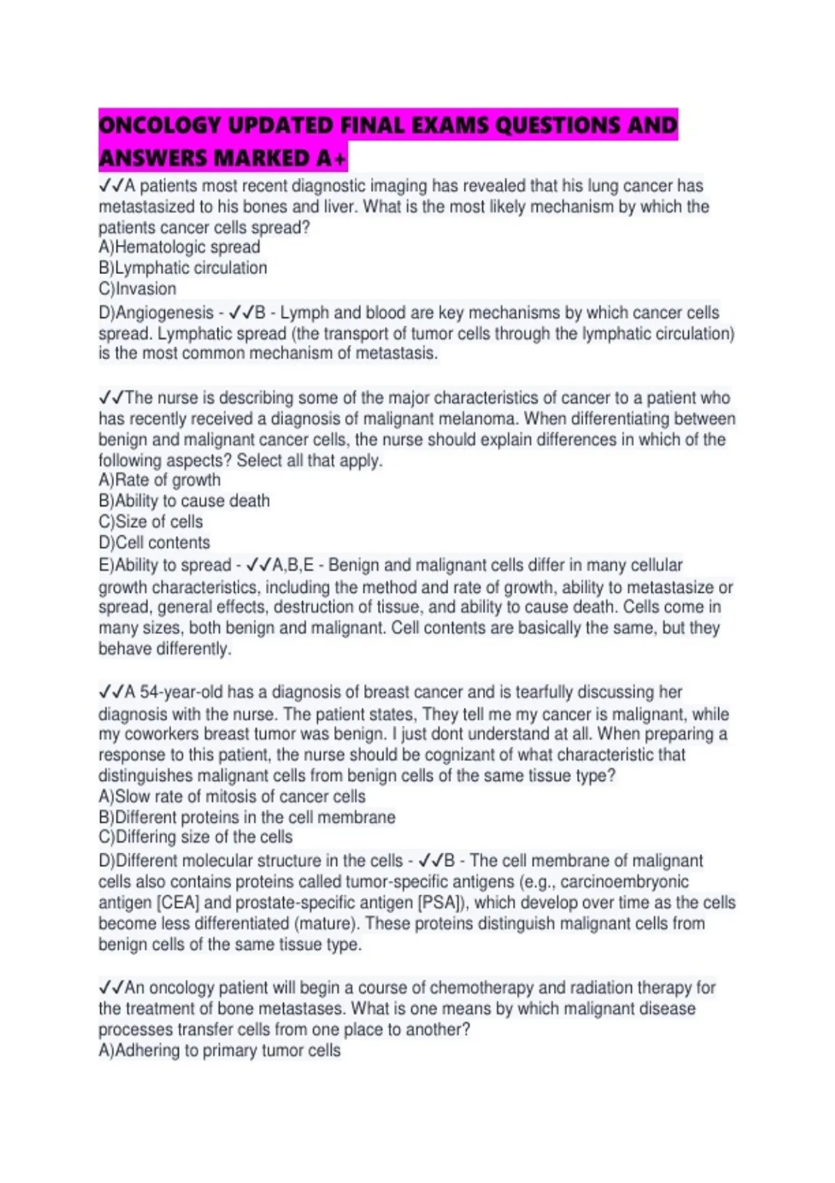 ONCOLOGY UPDATED FINAL EXAMS QUESTIONS AND ANSWERS MARKED