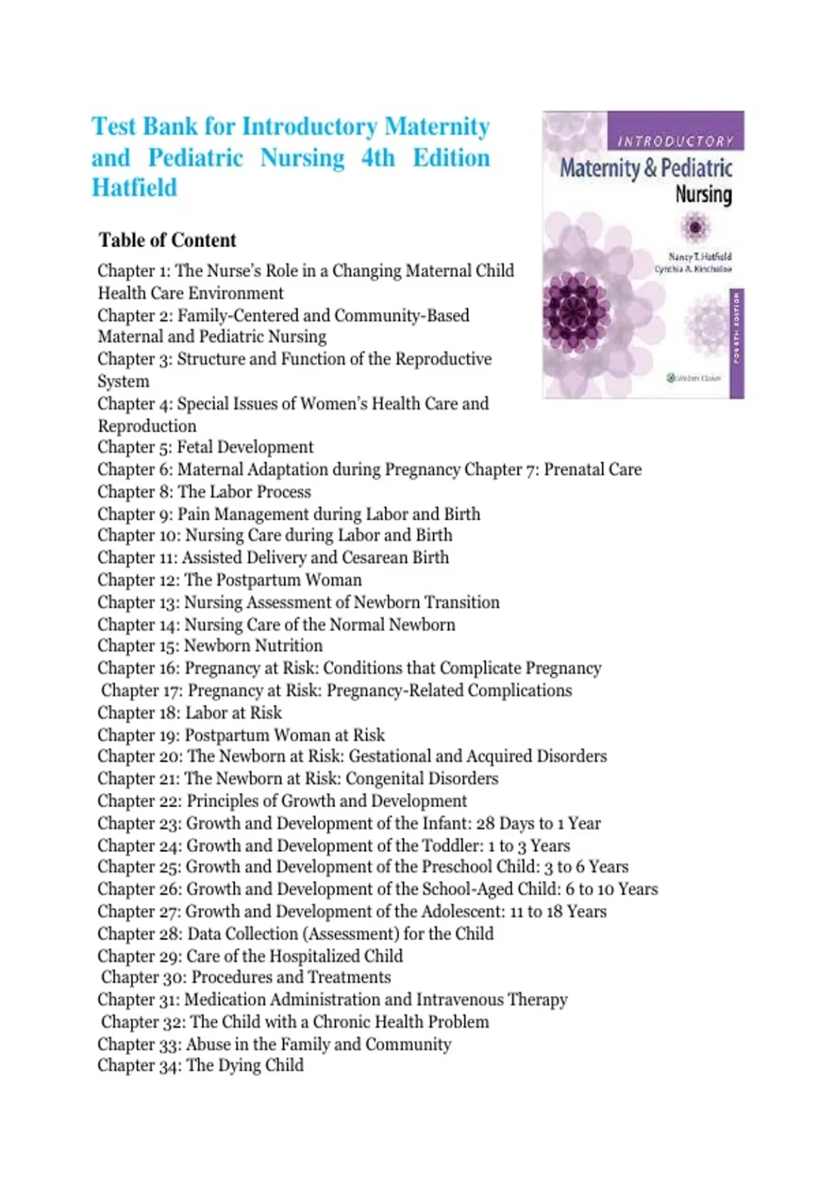 This test bank for Introductory Maternity and Pediatric Nursing 4th Edition by Hatfield includes comprehensive practice questions and answers covering maternal, newborn, and pediatric nursing care. It is designed to help nursing students prepare for exams and build a strong foundation in family-centered maternity and pediatric nursing practice.