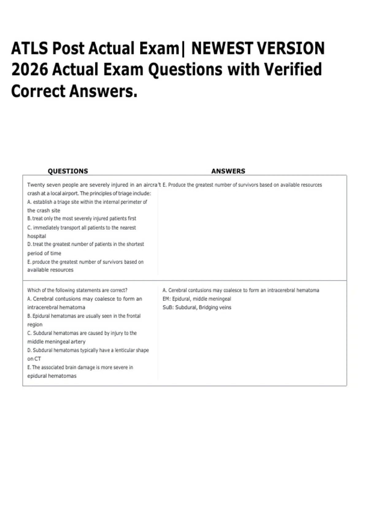Excel in your Advanced Trauma Life Support (ATLS) certification with this newest 2026 version of the post-test exam, featuring 21 pages of actual questions and 100% verified correct answers based on the latest ATLS 10th edition guidelines from the American College of Surgeons. This comprehensive study guide covers critical trauma management scenarios, including triage principles in a mass casualty aircraft crash emphasizing producing the greatest number of survivors based on available resources (answer: E), correct statements on brain injuries such as cerebral contusions coalescing to form an intracerebral hematoma (answer: A), distinctions between epidural hematomas (typically from middle meningeal artery injury, lenticular shape on CT, less severe associated brain damage) and subdural hematomas (from bridging veins, more severe brain damage), and key notes like EM for epidural/middle meningeal and SuB for subdural/bridging veins. Ideal for surgeons, emergency physicians, residents, nurses, paramedics, and medical students preparing for the ATLS written exam or recertification, this Q&A format with direct explanations ensures rapid review of primary/secondary surveys, shock resuscitation, thoracic/abdominal/head/spine trauma, pediatric/geriatric/pregnancy considerations, and ethical decisions—guaranteed to boost confidence and achieve A+ results in high-stakes trauma assessments.
