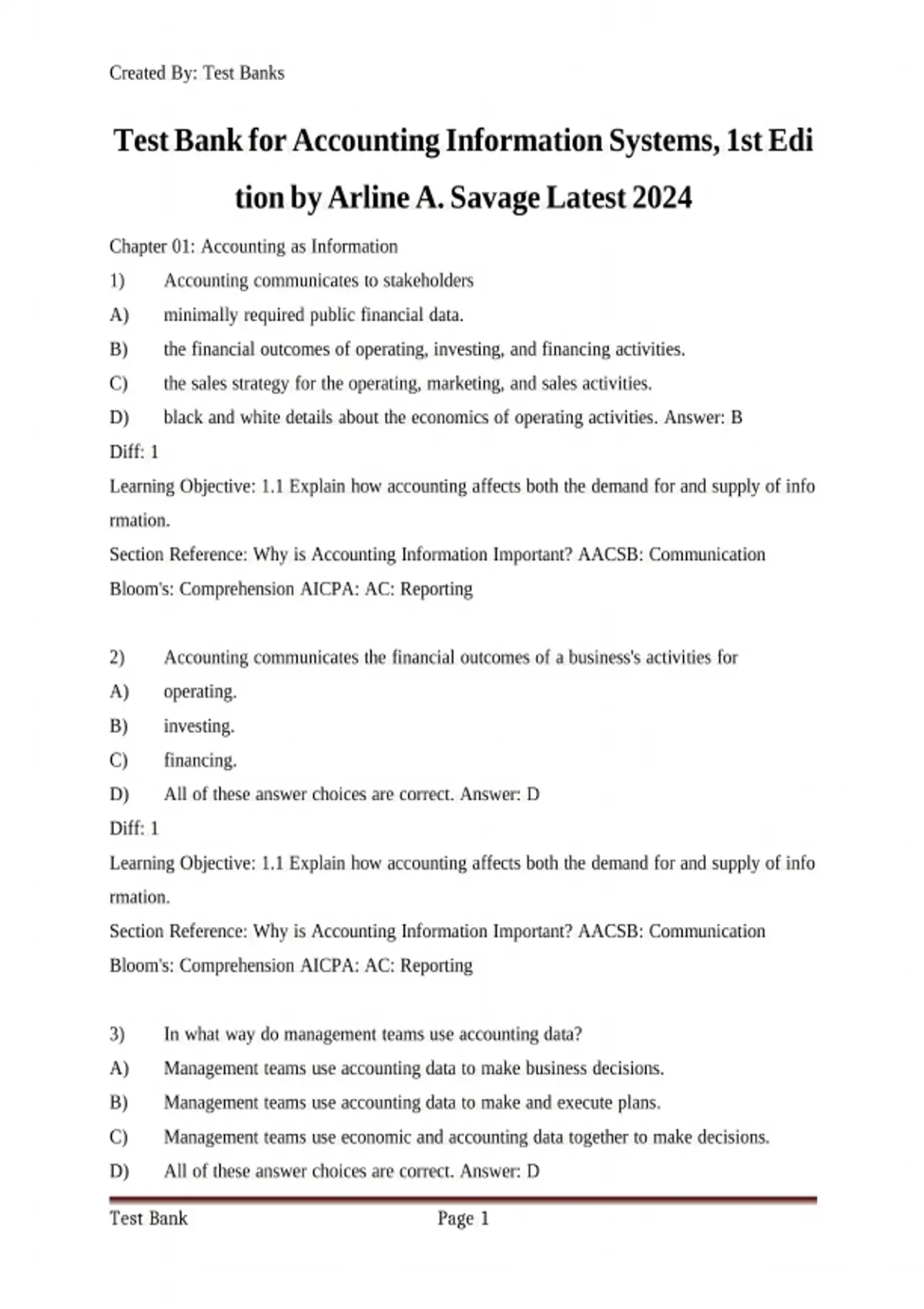 Test Bank for Accounting Information Systems, 1st Edition by Arline A. Savage