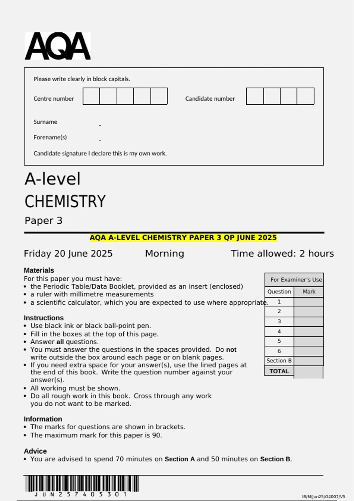 AQA A-LEVEL CHEMISTRY PAPER 3 QP JUNE 2025
