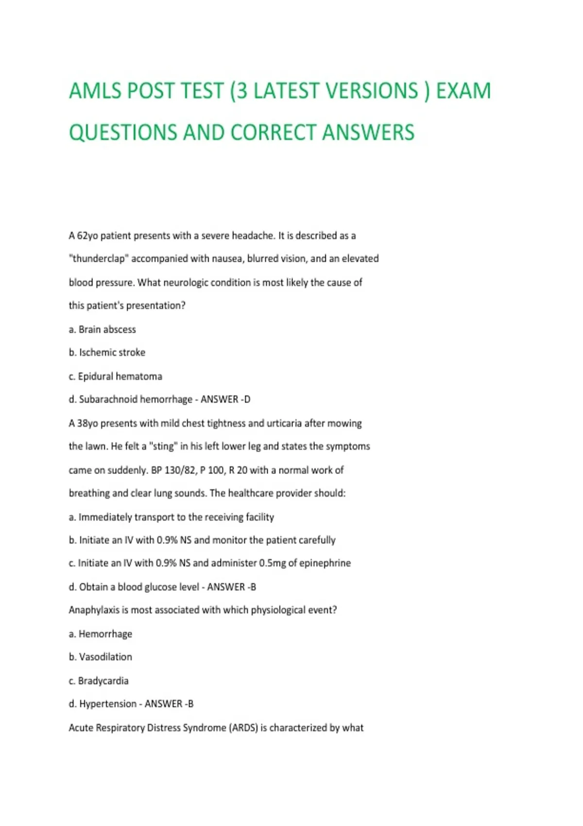 AMLS POST TEST (3 LATEST VERSIONS ) EXAM QUESTIONS AND CORRECT ANSWERS A 62yo patient presents with a severe headache. It is described as a "thunderclap" accompanied with nausea, blurred vision, and an elevated blood pressure. What neurologic condition is most likely the cause of this patient's presentation? a. Brain abscess b. Ischemic stroke c. Epidural hematoma d. Subarachnoid hemorrhage - ANSWER -D A 38yo presents with mild chest tightness and urticaria after mowing the lawn. He felt a "sting" in his left lower leg and states the symptoms came on suddenly. BP 130/82, P 100, R 20 with a normal work of breathing and clear lung sounds. The healthcare provider should: a. Immediately transport to the receiving facility b. Initiate an IV with 0.9% NS and monitor the patient carefully c. Initiate an IV with 0.9% NS and administer 0.5mg of epinephrine d. Obtain a blood glucose level - ANSWER -B Anaphylaxis is most associated with which physiological event? a. Hemorrhage b. Vasodilation c. Bradycardia d. Hypertension - ANSWER -B Acute Respiratory Distress Syndrome (ARDS) is characterized by what pathological change? a. Excessive mucous production b. Inflammation of the visceral pleura c. Breakdown of the alveolar-capillary membrane d. Accumulation of fluid between the pleural layers - ANSWER -C Continuous positive airway pressure would be most beneficial in treating which patient? a. A 43yo with a decreased LOC with respiratory difficulty b. A 22yo with severe asthma who is not responding to nebulizer treatments c. A 38yo with carpal pedal spasms, clear lung sounds, and respirations of 40/min d. A 55yo with jugular vein distension and a BP of 90/60 - ANSWER B What is the initial treatment for a patient experiencing hyperosmolar hyperglycemic nonketotic coma (HHNC)? a. Crystalloid IV fluid administration b. Administration of dextrose c. Administration of insulin d. Fluid bolus of 5% dextrose in water (D5W) - ANSWER -A What clinical findings are most commonly associated with a pulmonary embolus? a. Clear breath sounds with tachypnea b. Rhonchi auscultated bilaterally with hypercarbia c. Crackles heard in the bases with bradycardia d. Fever, tachycardia, and tachypnea with increased work of breathing - ANSWER -A What condition is most likely to cause respiratory acidosis? a. Anxiety/panic attack b. Narcotic overdose c. Methanol ingestion d. Diabetic ketoacidosis - ANSWER -B A 55-year-old complains of an 'aching' chest discomfort that persists over several days. The patient has a temperature of 101F (38.3C). Which finding will help narrow the diagnosis to pericarditis? a. Pain is relieved when supine b. Pulsus alternans is present c. S3 gallop is auscultated d. ST-segment elevation in all leads - ANSWER -D Your patient has had a seizure secondary to a nerve agent exposure. What medication would be best to diminish the seizure? a. Atropine b. Diphenhydramine c. Midazolam d. Pralidoxime - ANSWER -C Respiratory alkalosis may occur as a result of: a. Fever and anxiety b. Renal failure and dehydration c. Airway obstruction and chest wall pain d. Prolonged vomiting - ANSWER -A An age-related change that increases the risk of respiratory compromise is: a. Increase of mucus production b. Increase in intrathoracic volume c. Decrease in lung compliance d. Decrease in dead space ventilation - ANSWER -C Paroxysmal nocturnal dyspnea is most common in patients with a history of: