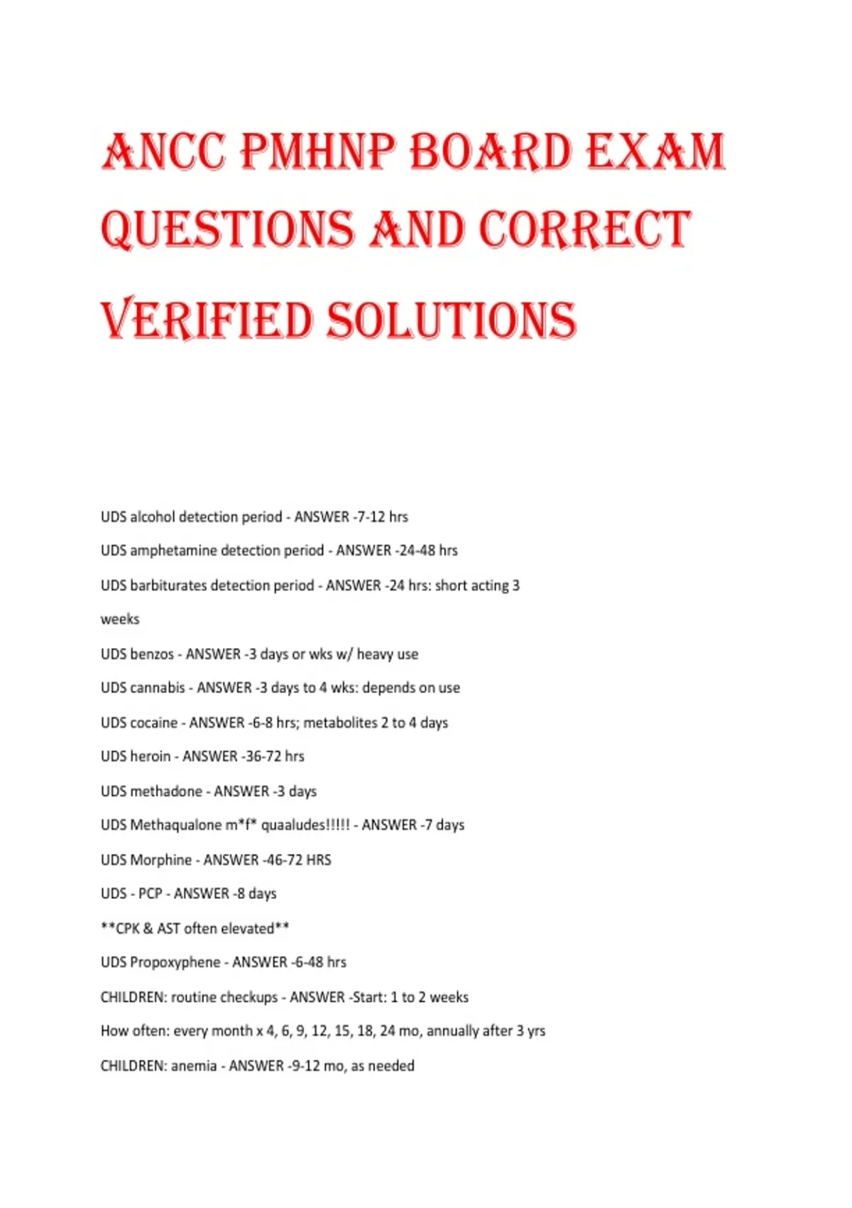 ANCC PMHNP BOARD EXAM Questions AND CORRECT Verified Solutions UDS alcohol detection period - ANSWER -7-12 hrs UDS amphetamine detection period - ANSWER -24-48 hrs UDS barbiturates detection period - ANSWER -24 hrs: short acting 3 weeks UDS benzos - ANSWER -3 days or wks w/ heavy use UDS cannabis - ANSWER -3 days to 4 wks: depends on use UDS cocaine - ANSWER -6-8 hrs; metabolites 2 to 4 days UDS heroin - ANSWER -36-72 hrs UDS methadone - ANSWER -3 days UDS Methaqualone m*f* quaaludes!!!!! - ANSWER -7 days UDS Morphine - ANSWER -46-72 HRS UDS - PCP - ANSWER -8 days **CPK & AST often elevated** UDS Propoxyphene - ANSWER -6-48 hrs CHILDREN: routine checkups - ANSWER -Start: 1 to 2 weeks How often: every month x 4, 6, 9, 12, 15, 18, 24 mo, annually after 3 yrs CHILDREN: anemia - ANSWER -9-12 mo, as needed CHILDREN: blood test for lead - ANSWER -9 to 12 mo, annually after if in high risk area CHILDREN: UA - ANSWER -age 5, as needed CHILDREN: BP - ANSWER -age 3, annually CHILDREN: hearing and vision - ANSWER -start:prior to discharge or 1 mo, prior to discharge and by 6 mo how often: annually at age 4/3, screen for strabismus btwn 3 and 5 Tanner Stage 1 (boys and girls) - ANSWER -Boys: preadolescent testes, scrotum, penis Girls: preadolescent breasts Pubic hair: Preadolescent Tanner Stage 2 (boys and girls) - ANSWER -Boys: Enlargement of scrotum, testes; scrotum roughens and reddens Girls: Breast buds w/ areolar enlargement Pubic hair: Sparse, pale, fine Tanner Stage 3 (boys and girls) - ANSWER -Boys: Penis elongates Girls: Breast enlargement without separate nipple contour Pubic hair: Darker, increased amount, curlier Tanner Stage 4 (boys and girls) - ANSWER -Boys: Penis enlarges in breadth and development of glans; rugae appear Girls: Areola and nipple project as secondary mound Pubic hair: Adult in character but not as voluminous Tanner Stage 5 (Boys and girls) - ANSWER -Boys: Adult shape and appearance Girls: Adult breast; areola recedes, nipple retracts Pubic hair: Adult pattern Trust vs. Mistrust - ANSWER -Erikson: 0-18 mo: If needs are dependably met, infants develop a sense of basic trust Failure: Difficult receiving and giving Autonomy vs. Shame and Doubt - ANSWER -Erikson: 18 mo-3 yrs: Erikson's stage in which a toddler learns to exercise will and to do things independently; Goal: self-control, will power, control of body Failure: lack of self-confidence and rage against ones' self Initiative vs. Guilt - ANSWER -Erikson: 3-6 yrs: Goal: to identify and direct his/her activities Failure: feelings of inadequacy and guilt Industry vs. Inferiority - ANSWER -Erikson: 6-12 y.o. (school age): Goal: Self-confidence and peer recognition Failure: Low self-esteem and poor interpersonal relations identity vs. role confusion - ANSWER -Erikson's stage during which teenagers and young adults search for and become their true selves 12-20 y.o. Failure: Lack of direction and confidence in self schema (Piaget's theory of cognitive development) - ANSWER -A mental structure of patterns and thinking assimilation (Piaget) - ANSWER -Incorporating new information into current schemas according to new environmental stimuli perceived Accommodation (Piaget) - ANSWER -adjusting to new information by creating new schemas Equilibrium (Piaget's Theory) - ANSWER -symbiosis of sensory information and accumulated knowledge Equilibration (Piaget) - ANSWER -search for mental balance between cognitive schemes and information from the environment sensorimotor stage (Piaget) - ANSWER -0-2 yrs