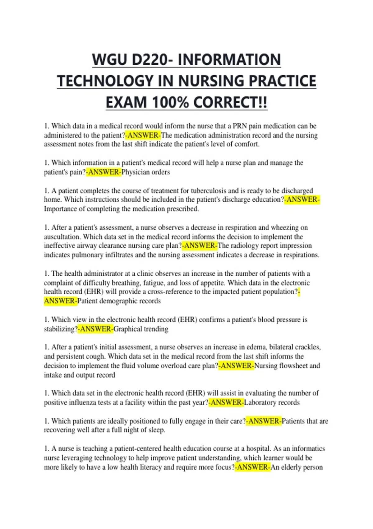 1. A nurse is teaching a patient-centered health education course at a hospital. As an informatics