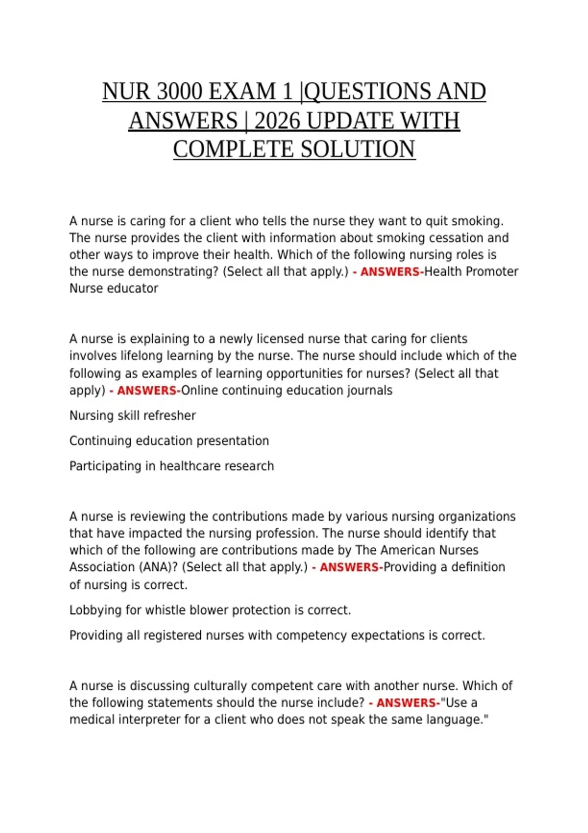 Prepare effectively for NUR 3000 Exam 1 with this fully updated 2026 guide. Includes all questions with complete, step-by-step solutions to reinforce essential nursing concepts, clinical reasoning, and patient care knowledge. Ideal for exam prep, thorough review, and building confidence to achieve top performance.