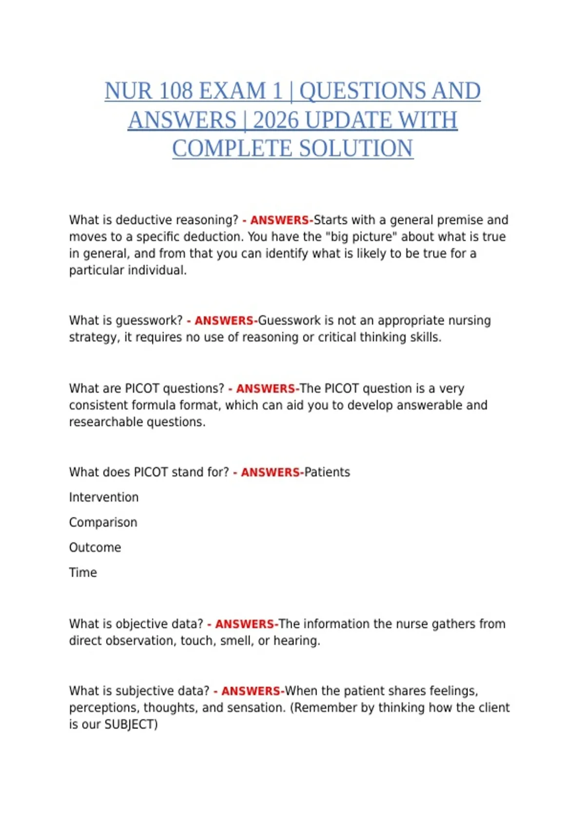 Prepare for NUR 108 Exam 1 with this fully updated 2026 resource. Includes all questions with complete, step-by-step solutions to strengthen understanding of essential nursing concepts, clinical reasoning, and patient care principles. Ideal for exam prep, comprehensive review, and boosting confidence for top performance.