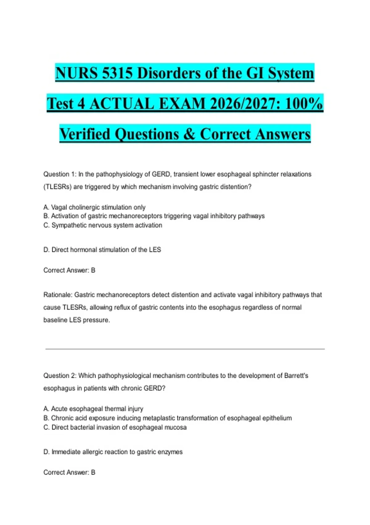 Ace your NURS 5315 Test 4 on Disorders of the Gastrointestinal System with this definitive 2026/2027 guide. It features the actual exam with 100% verified questions and correct answers, covering the pathophysiology of the liver, pancreas, gallbladder, and intestines, including conditions like hepatitis, pancreatitis, IBD, and GI cancers. Your key to mastering GI pathophysiology and achieving a top score.