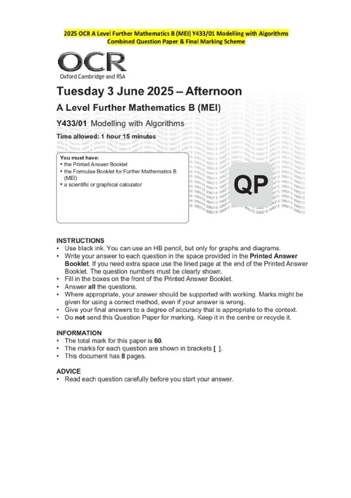 This document contains a comprehensive and integrated 2025 OCR A Level Further Mathematics B (MEI) Y433/01 Modelling with Algorithms question paper with a complete final marking scheme. It is designed to assess key algorithmic modelling concepts and problem-solving skills in line with the OCR MEI specification, making it suitable for revision, exam preparation, and academic reference.