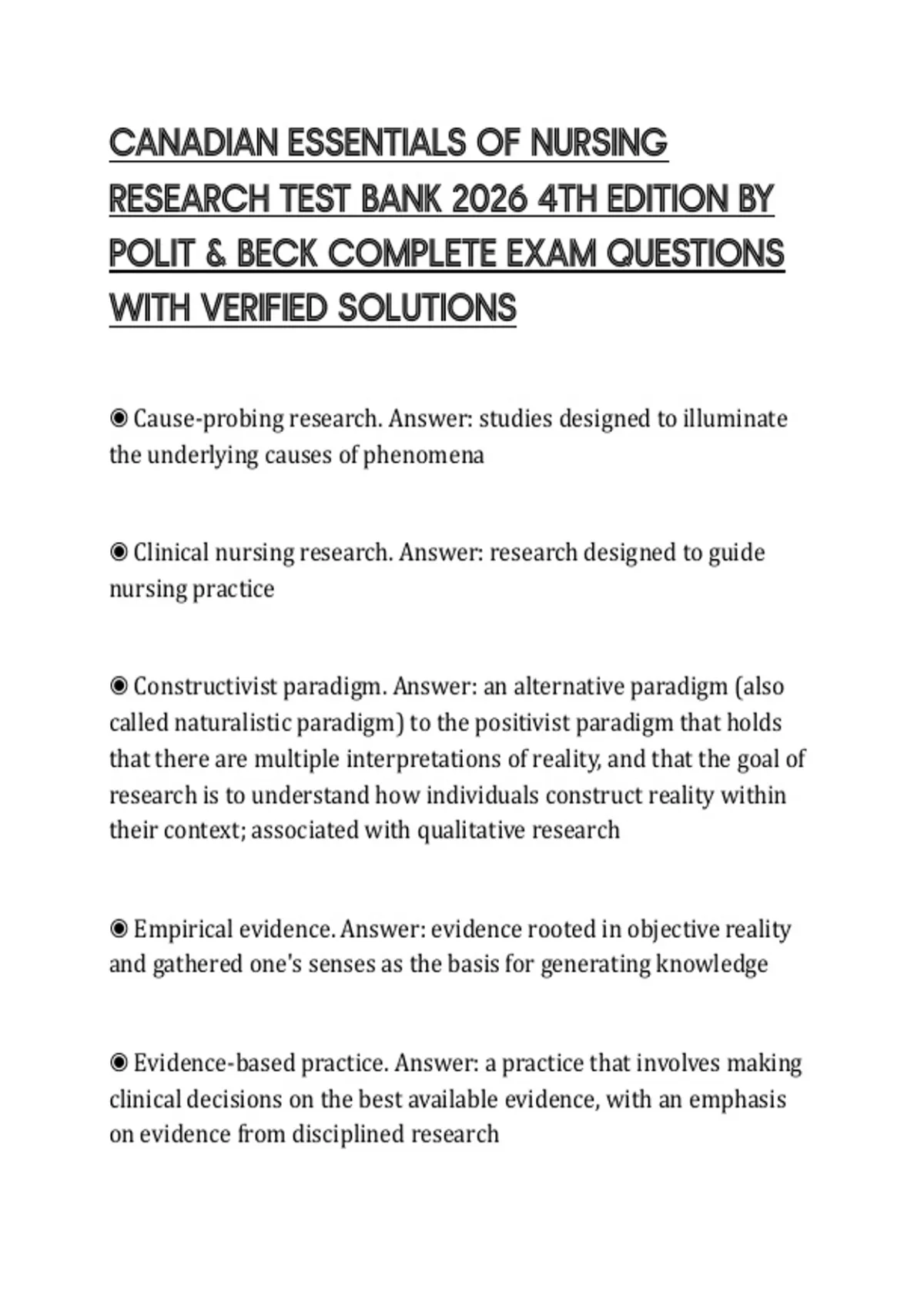 CANADIAN ESSENTIALS OF NURSING RESEARCH TEST BANK 2026 4TH EDITION BY POLIT & BECK COMPLETE EXAM QUESTIONS WITH VERIFIED SOLUTIONS