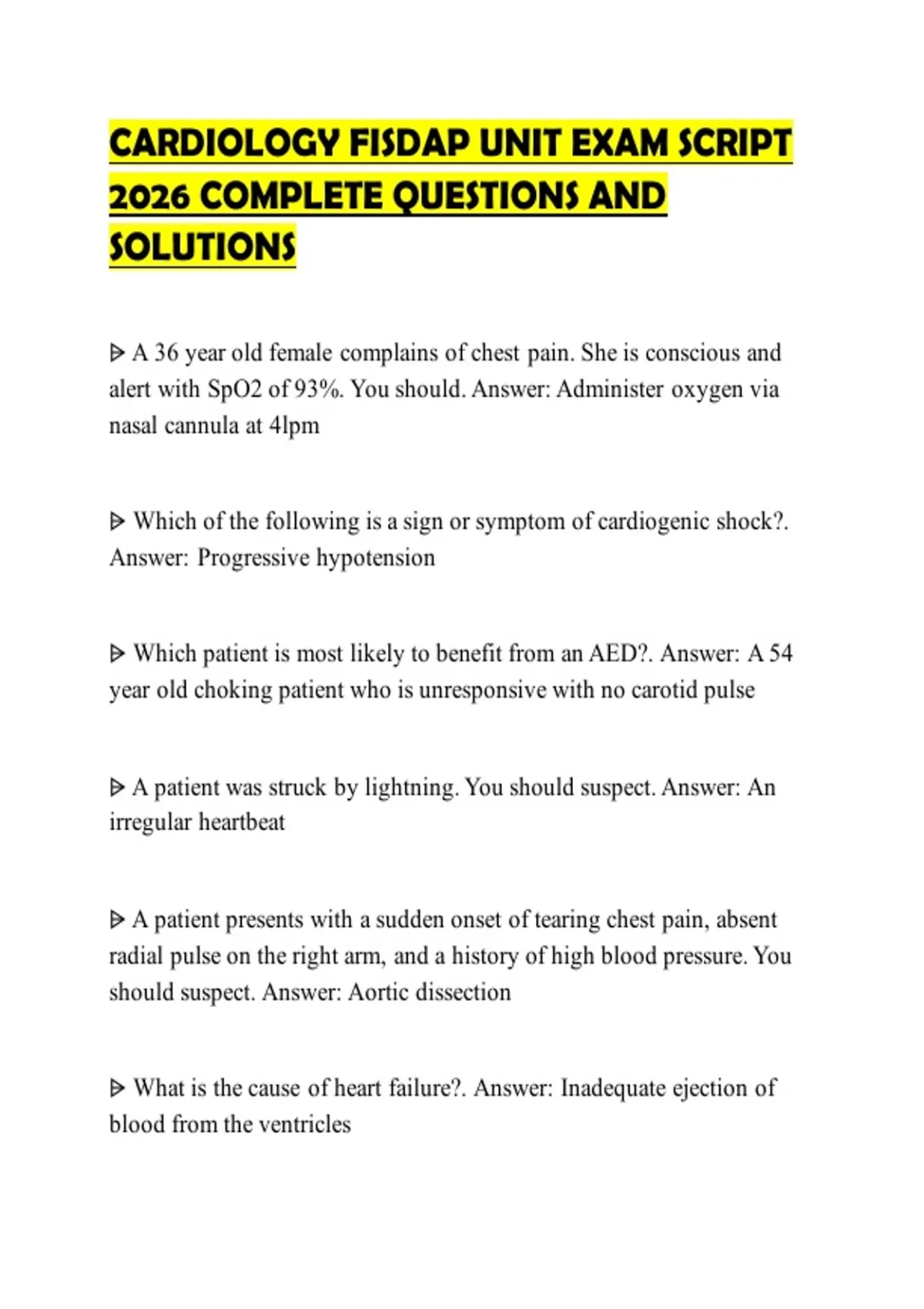 CARDIOLOGY FISDAP UNIT EXAM SCRIPT 2026 COMPLETE QUESTIONS AND SOLUTIONS