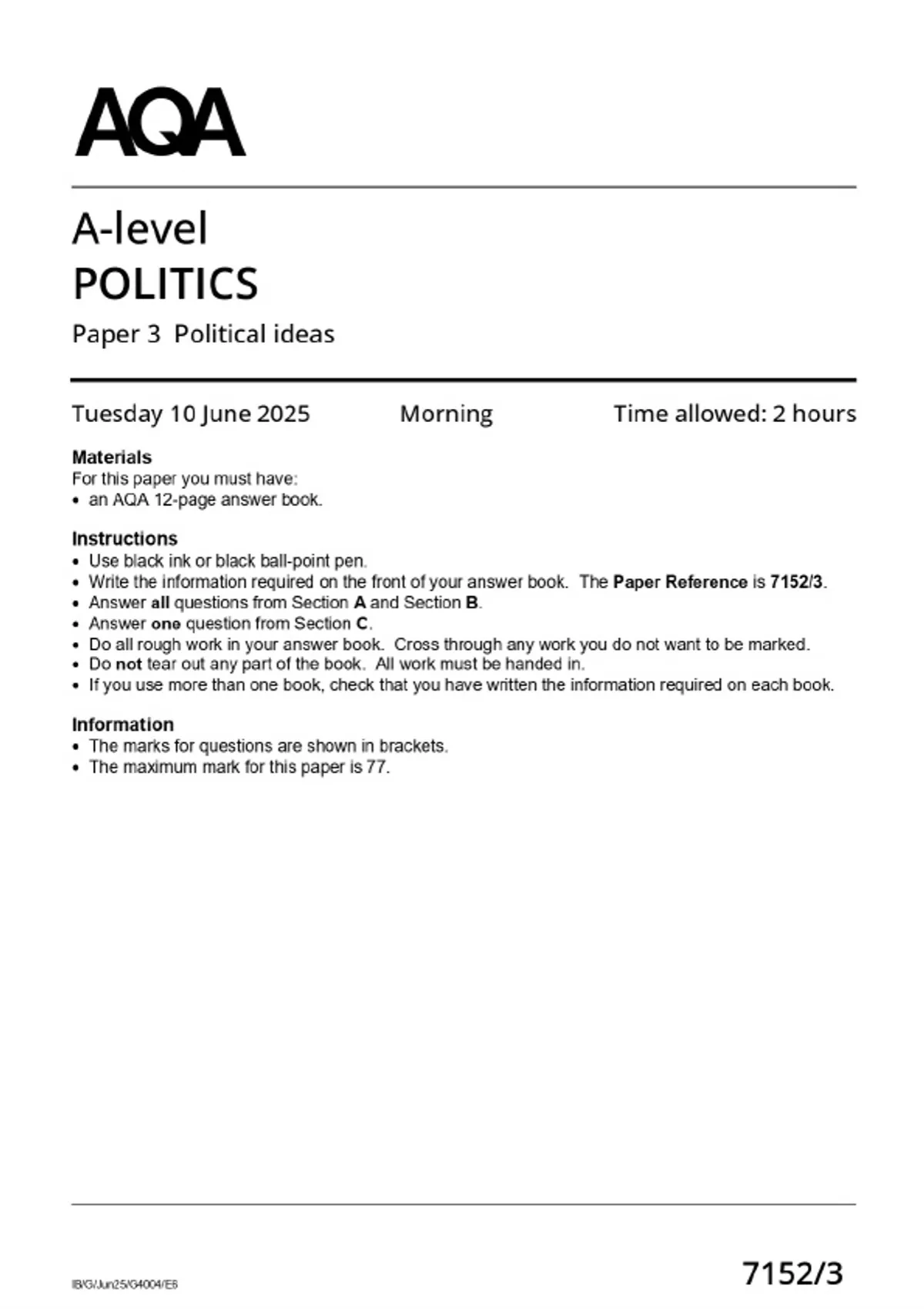 2025 AQA A-LEVEL Politics 7152/3 Paper 3 - Political Ideas MERGED QUESTION PAPER & MARKSCHEME