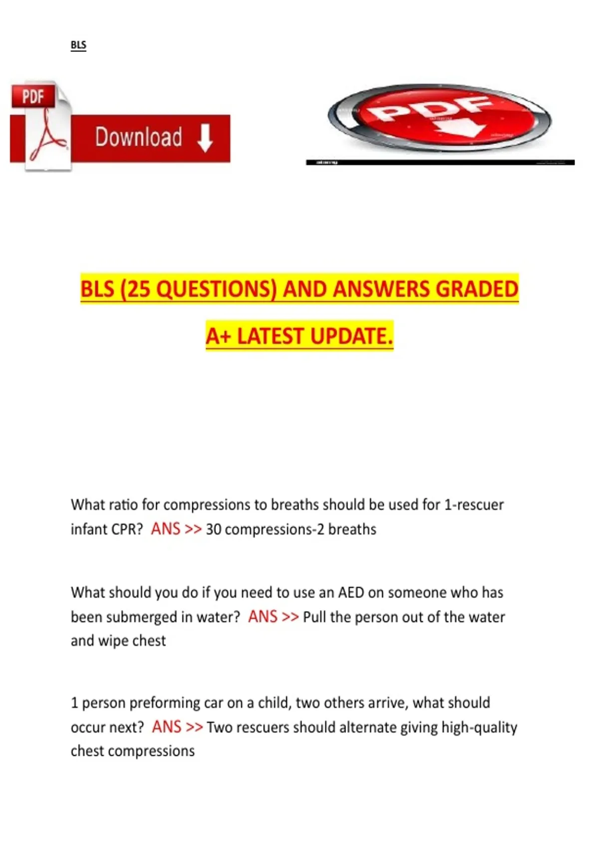 This document includes 25 carefully selected BLS exam questions with accurate, up-to-date answers based on the latest Basic Life Support guidelines. It is ideal for exam preparation, practice, or review for students and healthcare professionals aiming to achieve a high score or recertification.