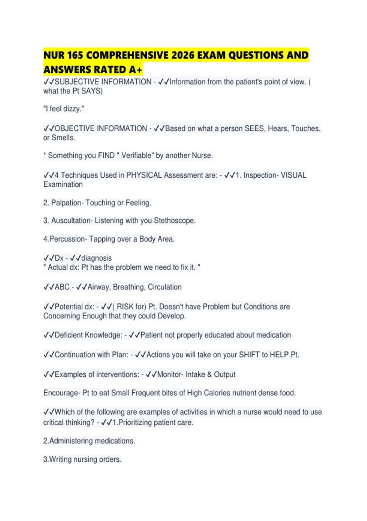 NUR 165 COMPREHENSIVE 2026 EXAM QUESTIONS AND