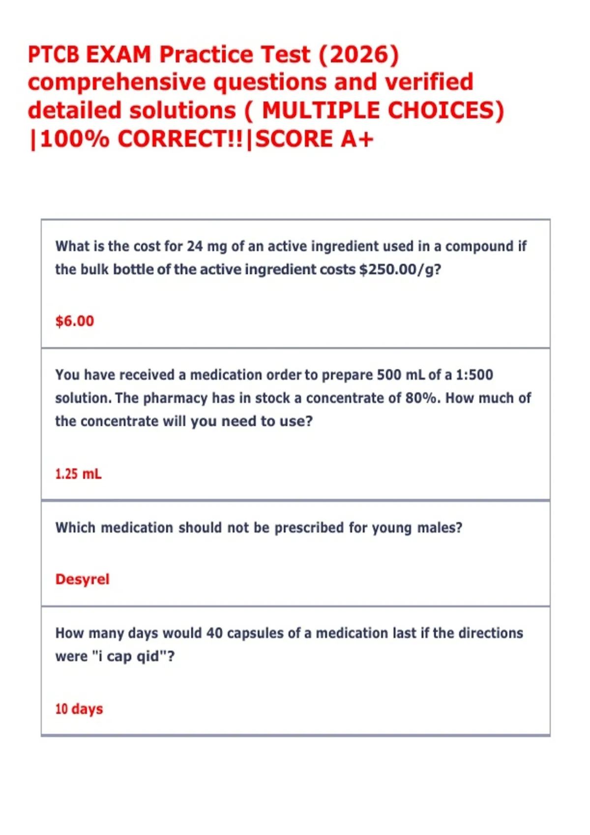 PTCB EXAM Practice Test (2026) comprehensive questions and verified detailed solutions ( MULTIPLE CHOICES) |100% CORRECT!!|SCORE A+PTCB EXAM Practice Test (2026) comprehensive questions and verified detailed solutions ( MULTIPLE CHOICES) |100% CORRECT!!|SCORE A+PTCB EXAM Practice Test (2026) comprehensive questions and verified detailed solutions ( MULTIPLE CHOICES) |100% CORRECT!!|SCORE A+PTCB EXAM Practice Test (2026) comprehensive questions and verified detailed solutions ( MULTIPLE CHOICES) |100% CORRECT!!|SCORE A+PTCB EXAM Practice Test (2026) comprehensive questions and verified detailed solutions ( MULTIPLE CHOICES) |100% CORRECT!!|SCORE A+PTCB EXAM Practice Test (2026) comprehensive questions and verified detailed solutions ( MULTIPLE CHOICES) |100% CORRECT!!|SCORE A+PTCB EXAM Practice Test (2026) comprehensive questions and verified detailed solutions ( MULTIPLE CHOICES) |100% CORRECT!!|SCORE A+