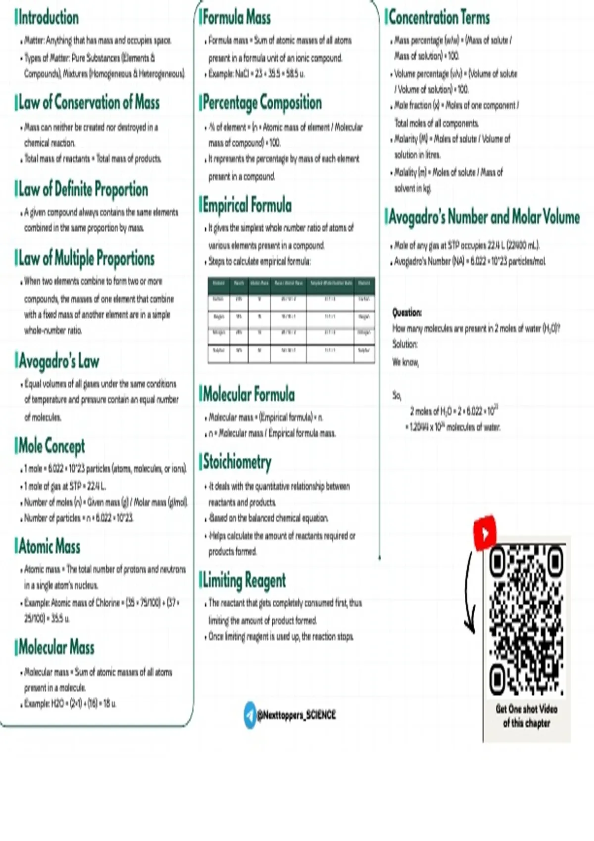 Compounds), Mixtures (Homogeneous & Heterogeneous). Example: NaCl = 23 + 35.5 = 58.5 u. Volume percentage (v/v) = (Volume of solute