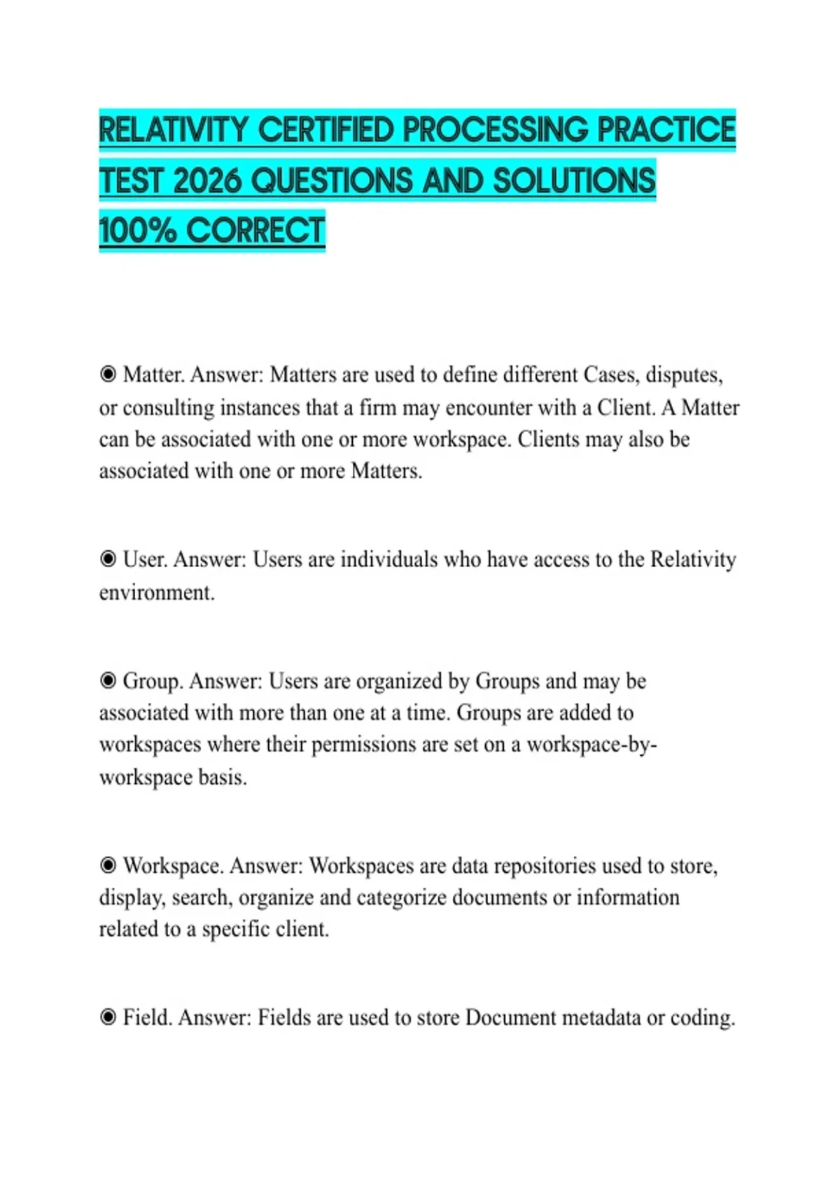 ◉ Field. Answer: Fields are used to store Document metadata or coding.