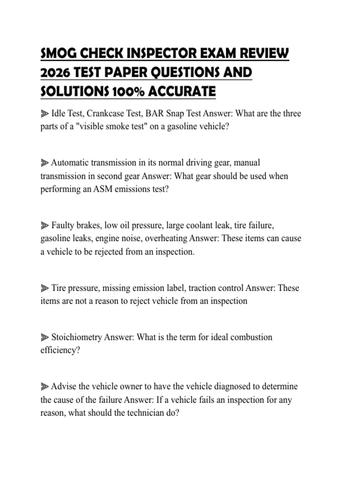 SMOG CHECK INSPECTOR EXAM REVIEW 2026 TEST PAPER QUESTIONS AND SOLUTIONS 100% ACCURATESMOG CHECK INSPECTOR EXAM REVIEW 2026 TEST PAPER QUESTIONS AND SOLUTIONS 100% ACCURATE