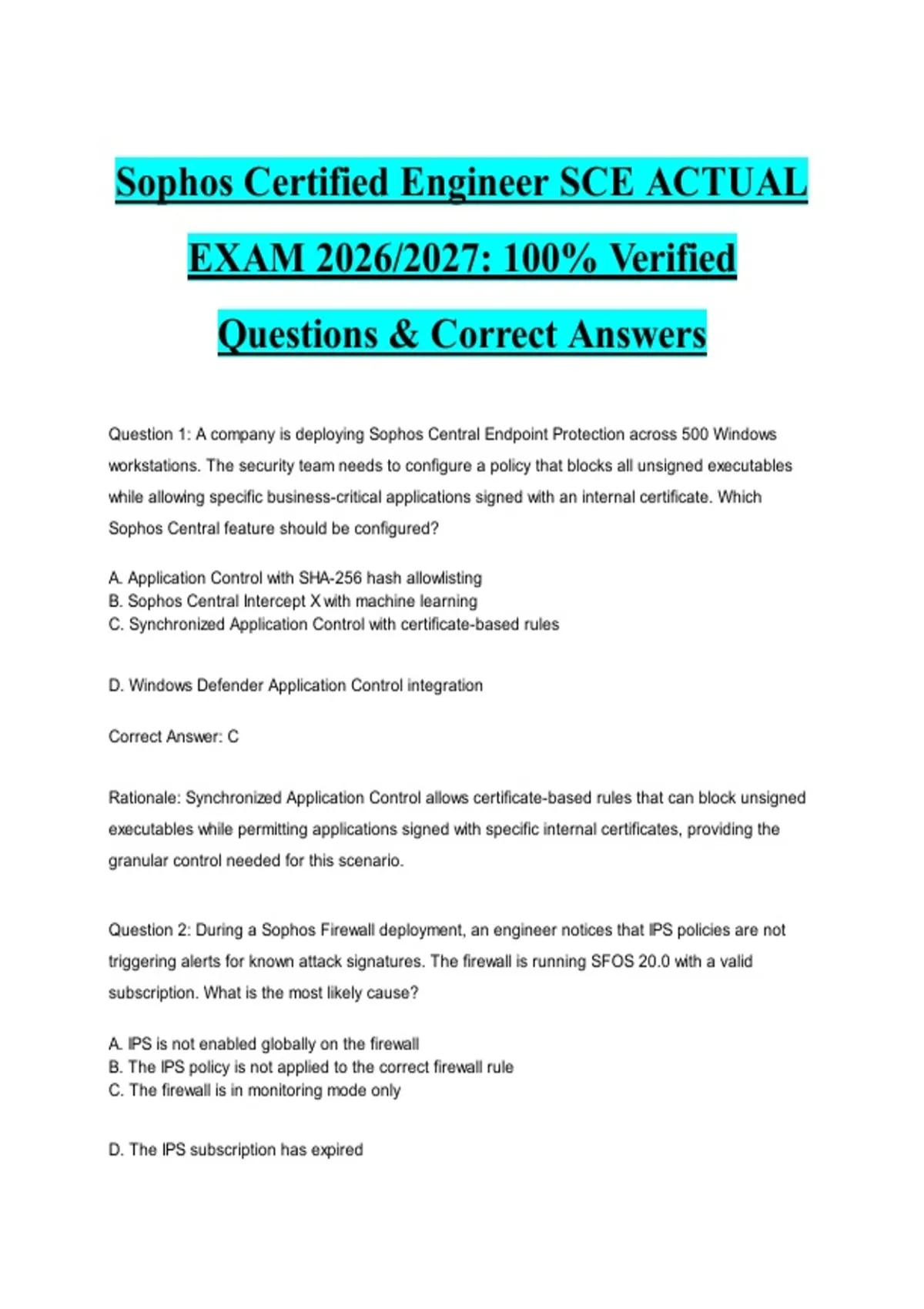 Question 1: A company is deploying Sophos Central Endpoint Protection across 500 Windows