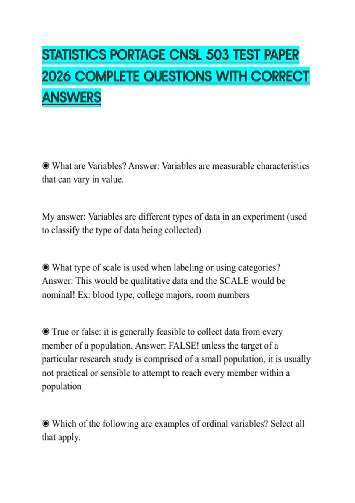 qualitative variable. Answer: Quantitative Ex: test scores, reaction time,