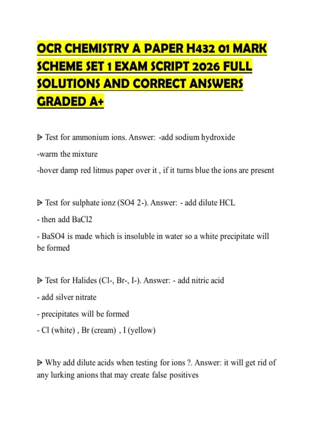 OCR CHEMISTRY A PAPER H432 01 MARK SCHEME SET 1 EXAM SCRIPT 2026 FULL SOLUTIONS AND CORRECT ANSWERS GRADED A+