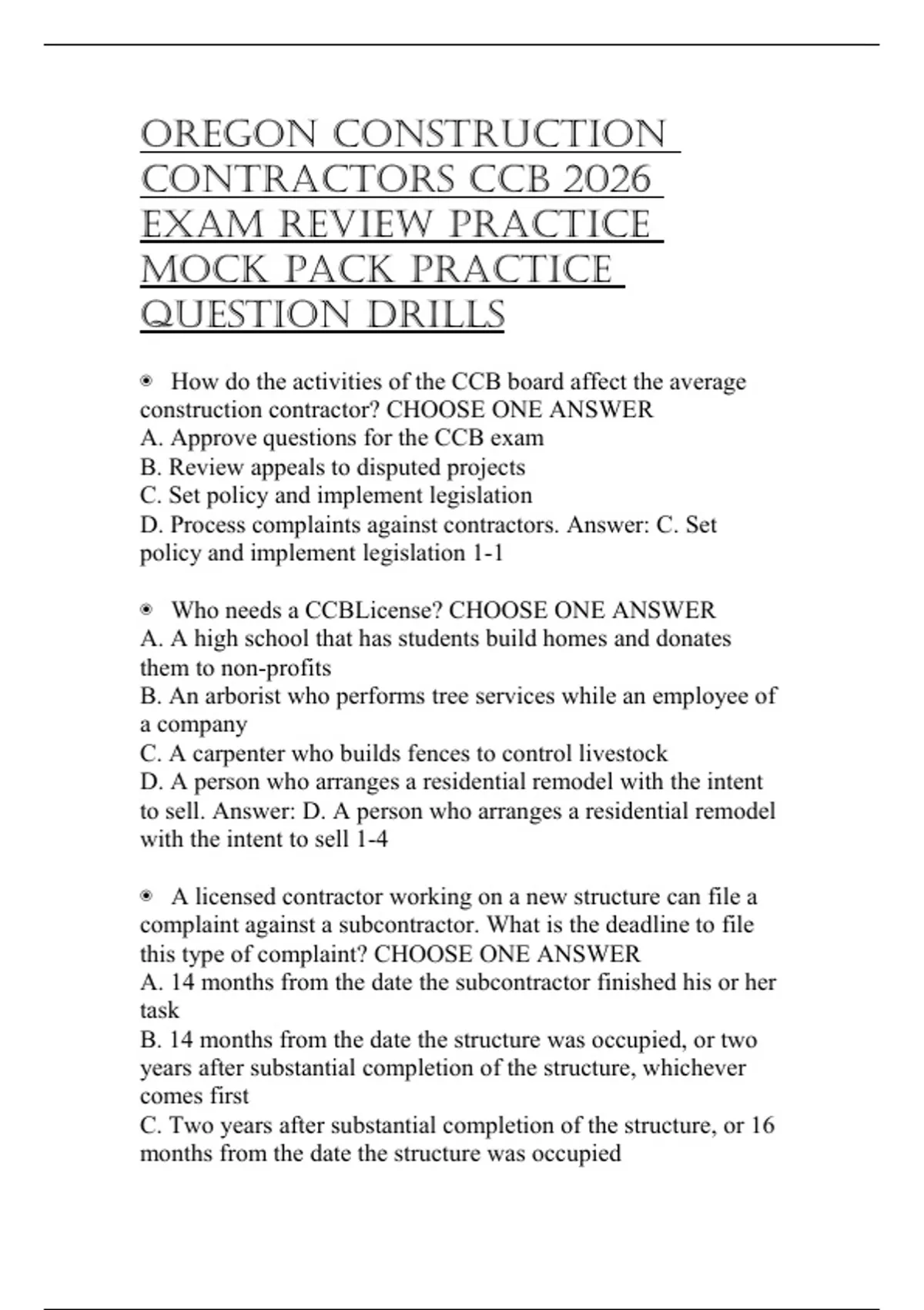 OREGONCONSTRUCTIONCONTRACTORS CCB2026EXAMREVIEWPRACTICEMOCK PACKPRACTICEQUESTIONDRILLS
