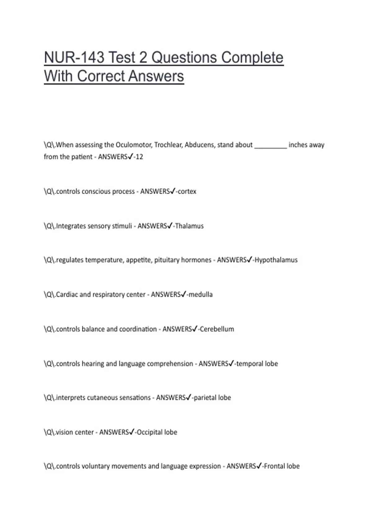 NUR-143 Test 2 Questions Complete With Correct Answers Q.When assessing the Oculomotor, Trochlear, Abducens, stand about _________ inches away from the patient - ANSWERS-12 Q.controls conscious process - ANSWERS-cortex Q.Integrates sensory stimuli - ANSWERS-Thalamus Q.regulates temperature, appetite, pituitary hormones - ANSWERS-Hypothalamus Q.Cardiac and respiratory center - ANSWERS-medulla Q.controls balance and coordination - ANSWERS-Cerebellum Q.controls hearing and language comprehension - ANSWERS-temporal lobe Q.interprets cutaneous sensations - ANSWERS-parietal lobe Q.vision center - ANSWERS-Occipital lobe Q.controls voluntary movements and language expression - ANSWERS-Frontal lobe Q.primitive drives, sexual, and emotional arousal - ANSWERS-Limbic system Q.maintains consciousness and wakefulness - ANSWERS-Reticular activating system Q.protective covering of the brain and spine - ANSWERS-Meninges Q.To assess a Patient's level of awareness, what three areas of orientation should you test? - ANSWERS-Person, place, and time Q.What types of memory loss are often seen in the older adult? - ANSWERS-Immediate and recent Q.3 types of memory to assess to determine memory status? - ANSWERS-Immediate, recent and remote Q.Test this cranial nerve by smelling coffee - ANSWERS-Olfactory Q.Test this cranial nerve by using a Snellen eye chart (visual acuity) and cardinal fields - ANSWERS-Optic Q.Test this cranial nerve with pupillary reaction, and the ability to blink - ANSWERS-Oculomotor Q.Test this cranial nerve with downward and inward eye movements - ANSWERS-Trochlear Q.Test this cranial nerve is tested by opening and clenching jaws while the nurse palpates for popping (mastication nerve), AND by a soft touch on the face and neck - ANSWERS-Trigeminal Q.Test this cranial nerve with lateral eye movement, and eye movement in all directions - ANSWERS-Abducent Q.Test this cranial nerve with taste on anterior 2/3 of the tongue and facial movement such as raising eyebrows, smiling, puffing cheeks - ANSWERS-Facial Q.A test of this cranial nerve involves the whisper (hearing) test - ANSWERS-Acoustic Q.A test of this cranial nerve involves the posterior 1/3 portion of the tongue, gag test, yawning, and swallowing - ANSWERS-Glossopharyngeal Q.Test this cranial nerve by testing the gag reflex - ANSWERS-Vagus Q.Test this cranial nerve by examining shoulder muscle strength - ANSWERS-Spinoaccessory Q.Test this cranial nerve by testing range of motion of the tongue (push against cheeks and stick out tongue) - ANSWERS-Hypoglassal Q.Anxiety, confusion, pallor, cyanosis, increased BP and Respiration rate, and Dyspnea are all signs of _______ stage hypoxia - ANSWERS-Early Q.Combativeness, Diaphoresis, and clubbing of the fingers are all signs of _________ stage hypoxia - ANSWERS-Late