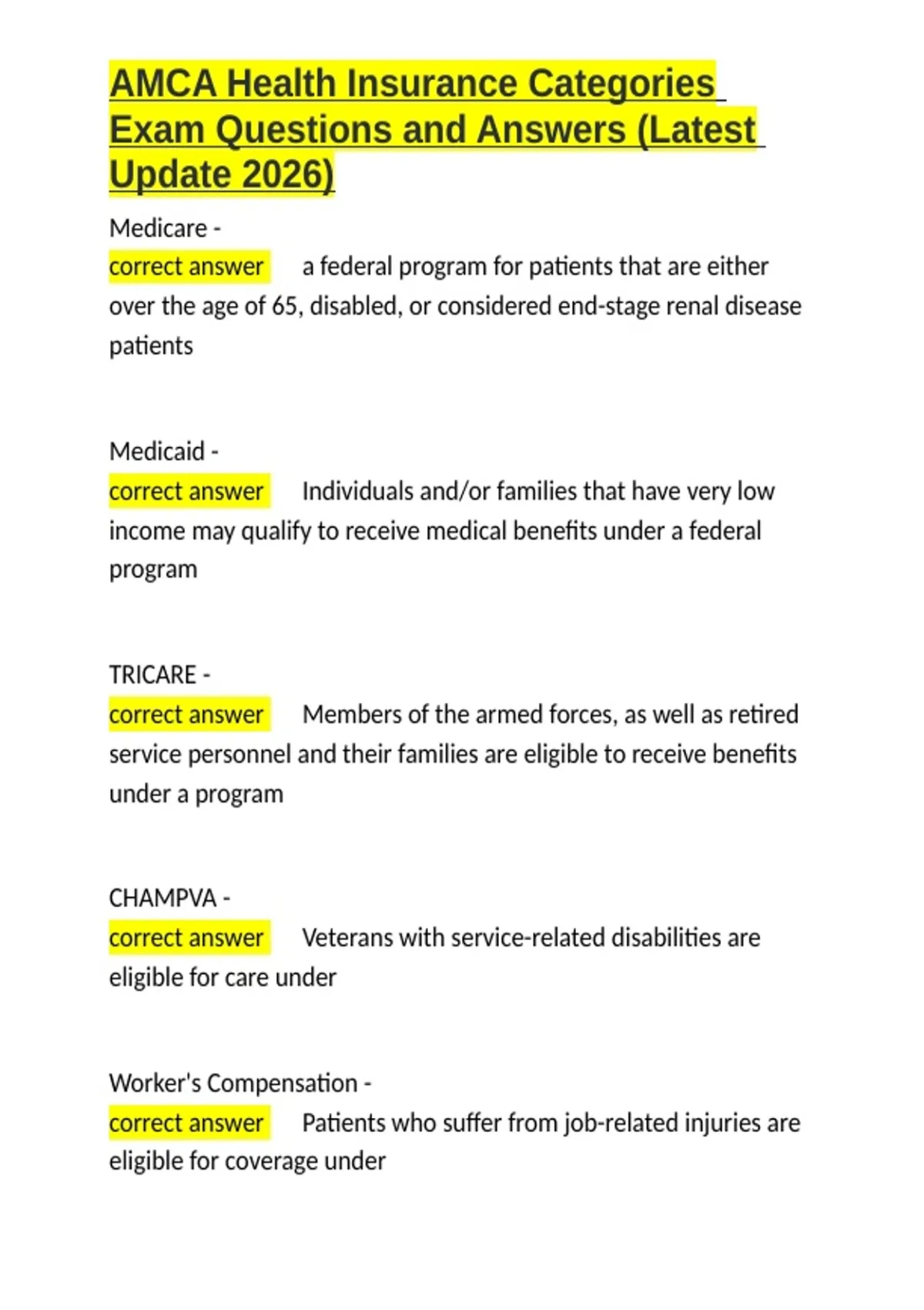 AMCA Health Insurance Categories Exam Questions and Answers (Latest Update 2026).docx
