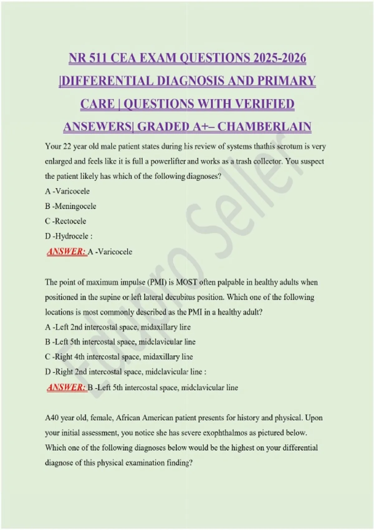 NR 511 CEA EXAM QUESTIONS |DIFFERENTIAL DIAGNOSIS AND PRIMARY CARE | QUESTIONS WITH VERIFIED ANSEWERS| GRADED A+– CHAMBERLAIN