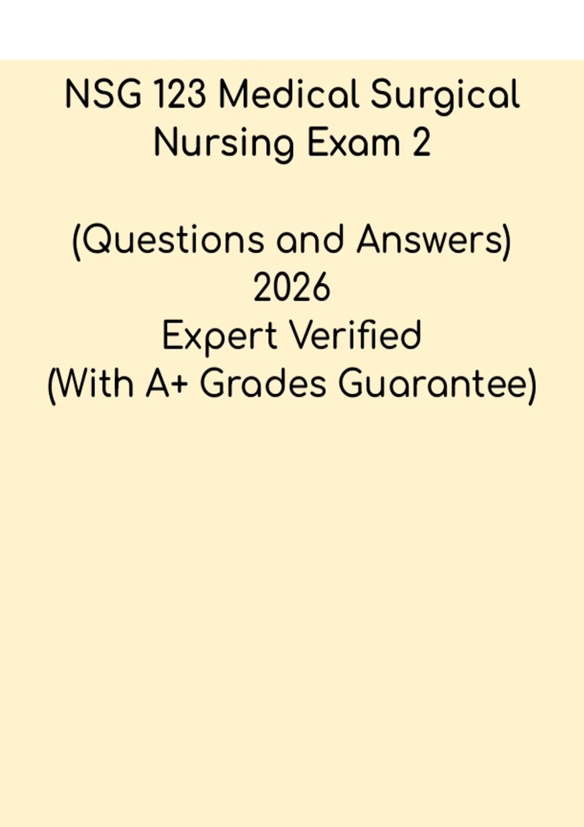 The NSG 123 Medical-Surgical Nursing Exam 2 PDF is a targeted study guide designed to help nursing students master core med-surg concepts commonly tested in Exam 2. This resource emphasizes clinical reasoning, patient care priorities, and NCLEX-style question formats to support exam success and real-world application. Ideal for ADN and BSN students, the guide breaks down complex medical-surgical topics into clear, test-ready explanations with practice questions to reinforce learning.