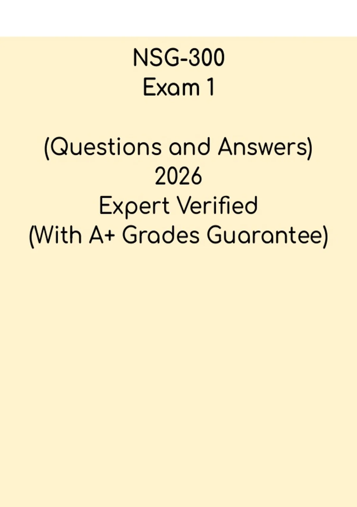 This NSG 300 Exam 1 PDF is a focused study guide designed for nursing students preparing for the first NSG 300 assessment. It covers essential nursing theory, patient care concepts, professional nursing roles, and foundational clinical reasoning principles commonly tested in early nursing courses. The guide includes exam-style practice questions and clear review notes to help students strengthen understanding and perform confidently on NSG 300 Exam 1.