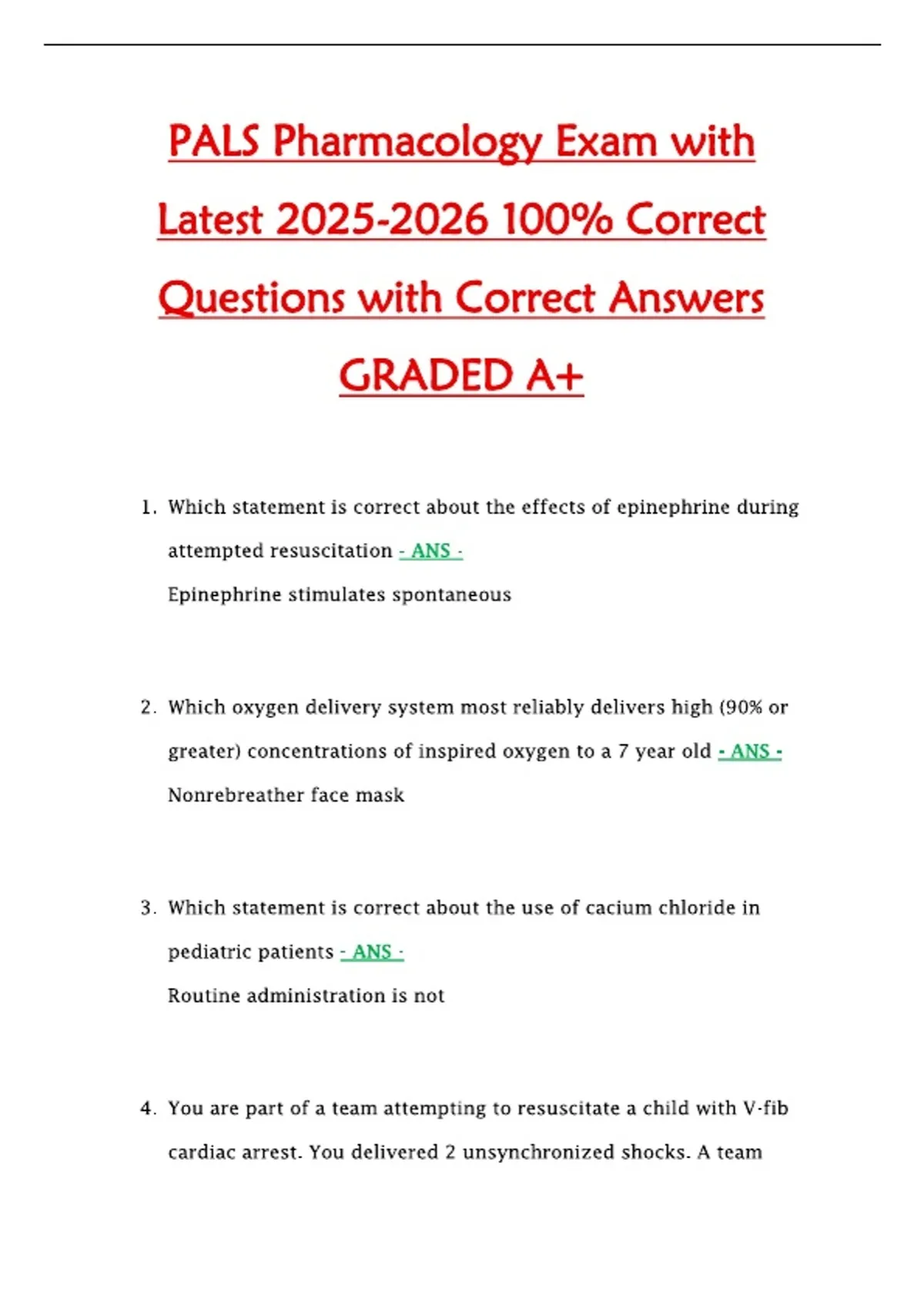 This PALS Pharmacology Exam guide provides the latest 2025–2026 questions with verified correct answers. It covers key pediatric pharmacology topics including emergency medications, drug dosages, mechanisms of action, adverse effects, indications, contraindications, and administration protocols, ensuring mastery of content and readiness to achieve a top score.