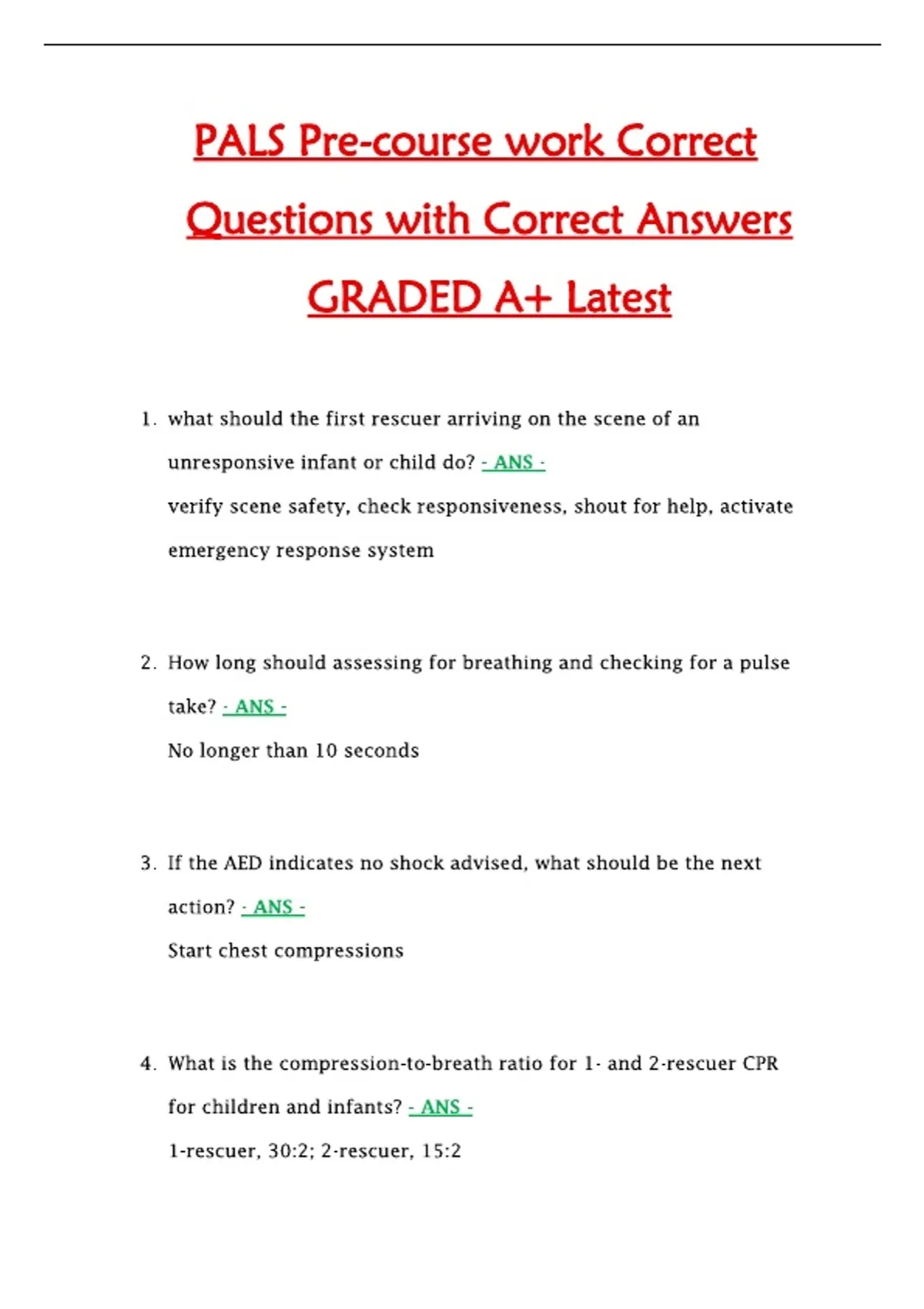 PALS Pre-course work Correct Questions with Correct Answers GRADED A+ Latest