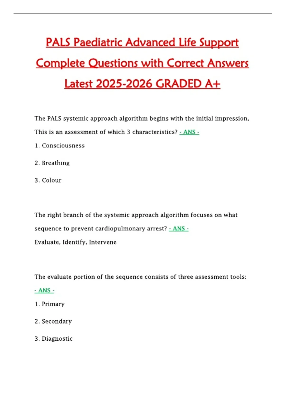 PALS Paediatric Advanced Life Support Complete Questions with Correct Answers Latest GRADED A+