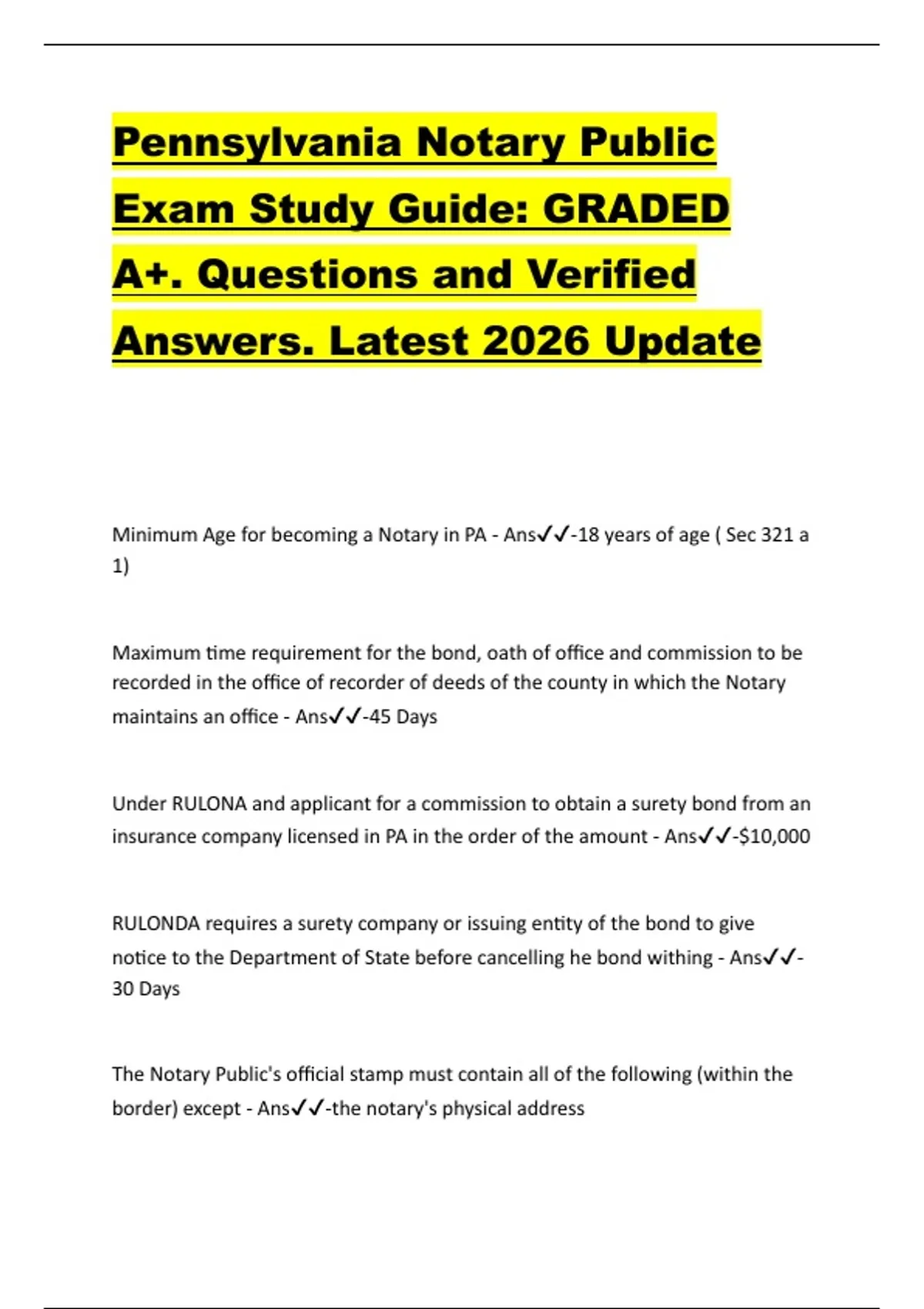 Pennsylvania Notary Public Exam Study Guide: GRADED A+. Questions and Verified Answers. Latest 2026 Update