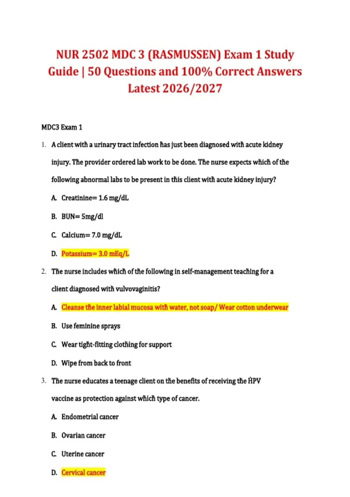 This study guide includes 50 focused practice questions with correct answers for NUR 2502 Multidimensional Care III (MDC 3) Exam 1 at Rasmussen University. It covers core Exam 1 topics such as clinical judgment, priority nursing interventions, patient assessment, and safe medication administration, aligned with the 2026/2027 curriculum.