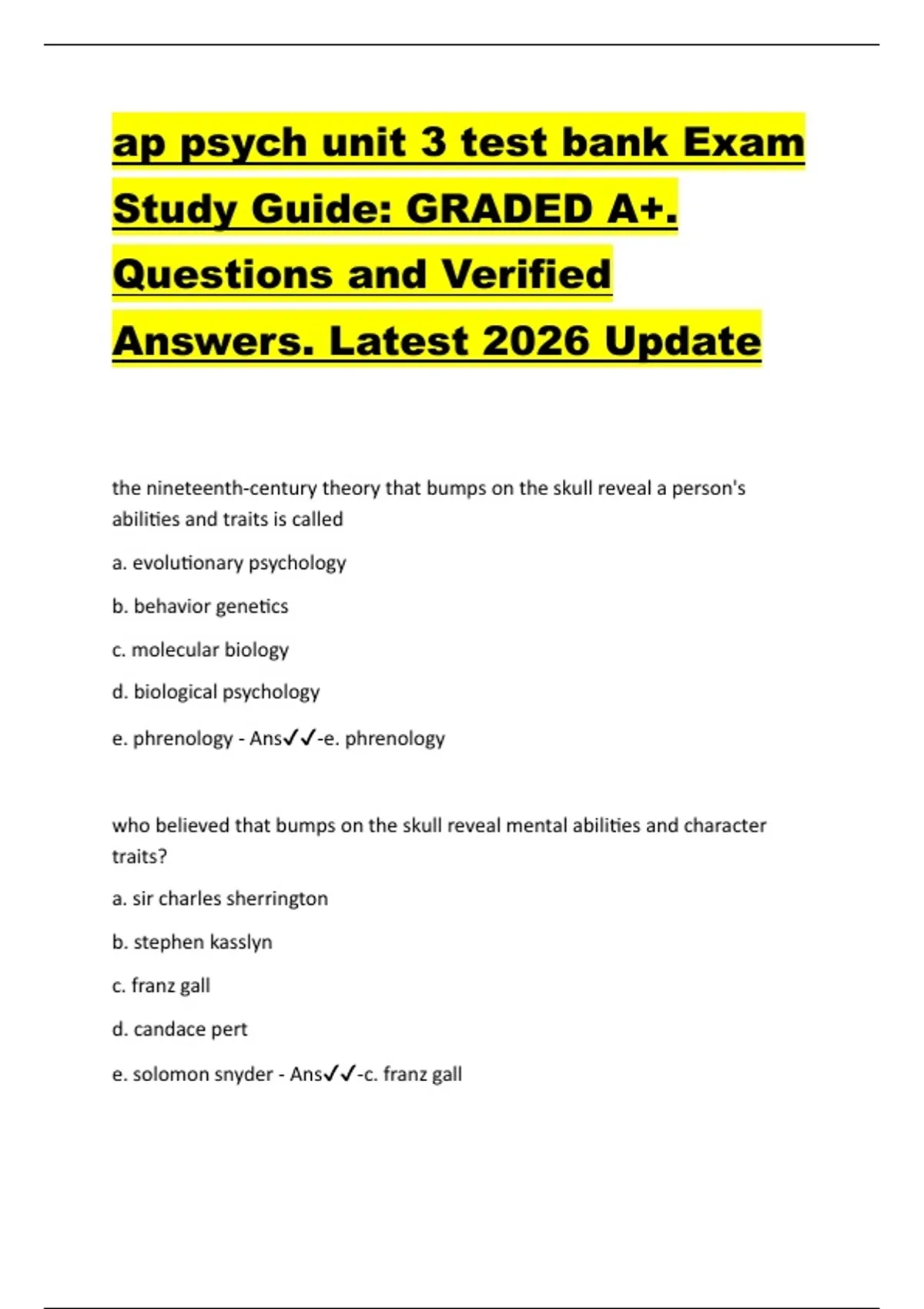 ap psych unit 3 test bank Exam Study Guide: GRADED A+. Questions and Verified Answers. Latest 2026 Update