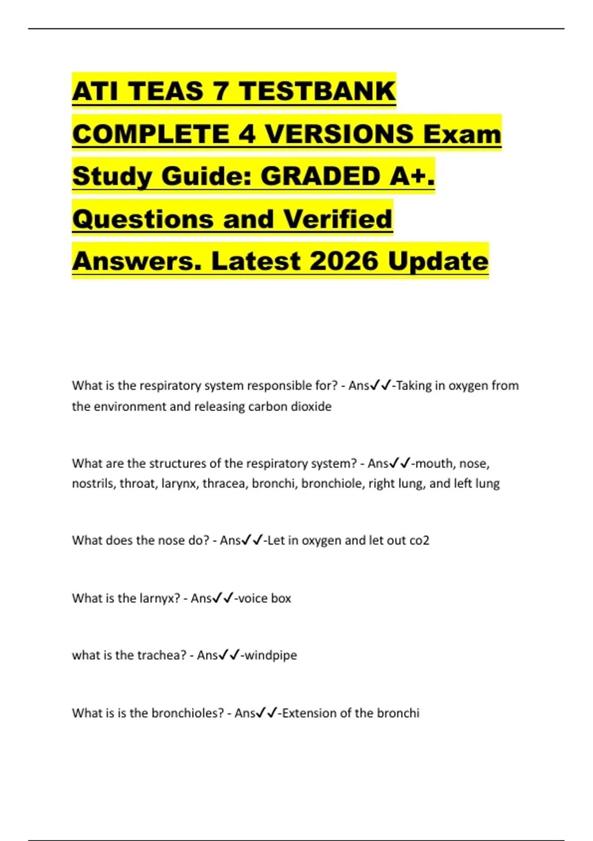 ATI TEAS 7 TESTBANK COMPLETE 4 VERSIONS Exam Study Guide: GRADED A+. Questions and Verified Answers. Latest 2026 Update ATI TEAS 7 TESTBANK COMPLETE 4 VERSIONS Exam Study Guide: GRADED A+. Questions and Verified Answers. Latest 2026 Update ATI TEAS 7 TESTBANK COMPLETE 4 VERSIONS Exam Study Guide: GRADED A+. Questions and Verified Answers. Latest 2026 Update