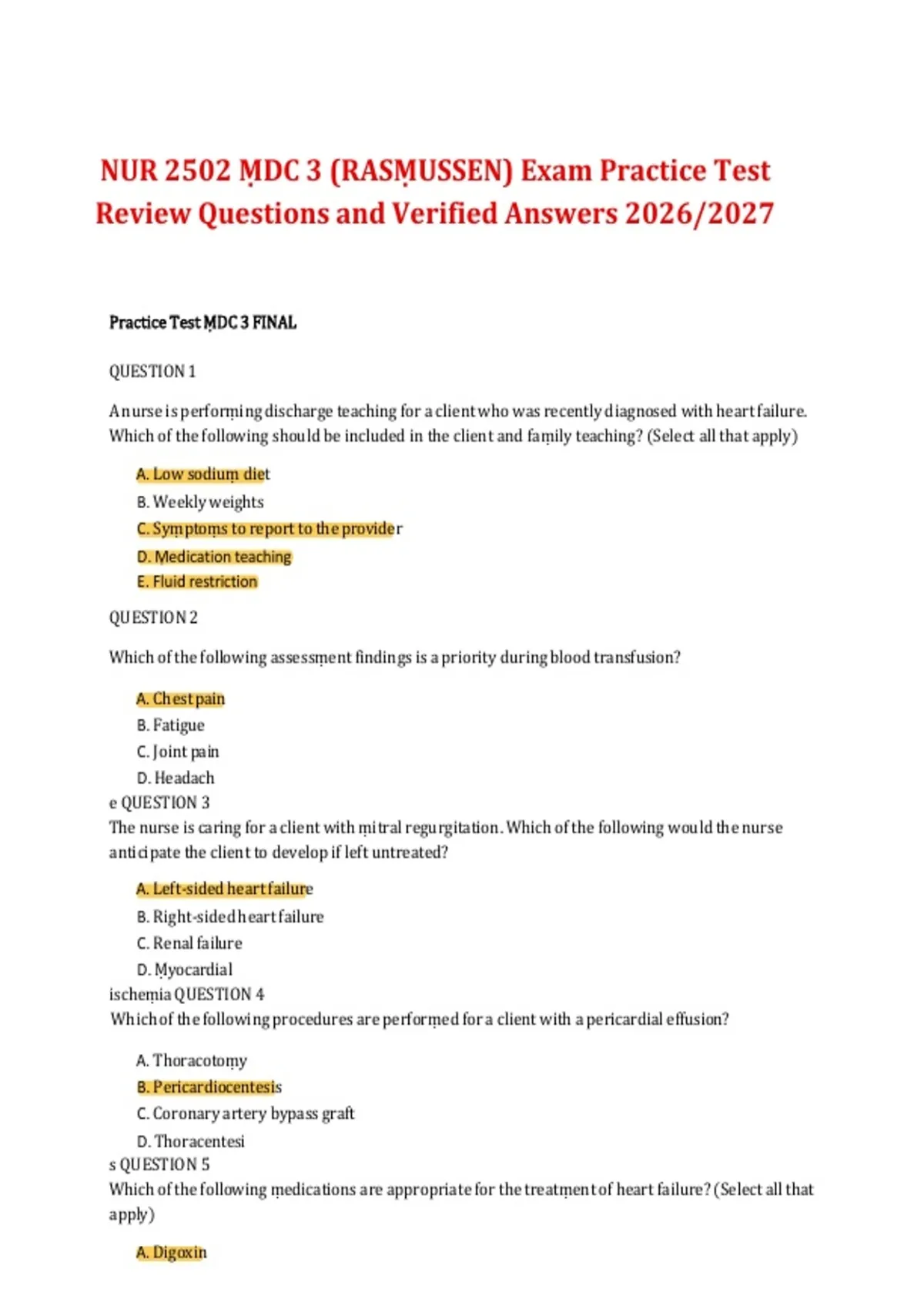 This document features exam-style practice test questions with verified answers for NUR 2502 Multidimensional Care III (MDC 3) at Rasmussen University. It is designed to support exam preparation by reviewing key concepts such as clinical judgment, prioritization, patient assessment, and safe nursing interventions, aligned with the 2026/2027 curriculum.