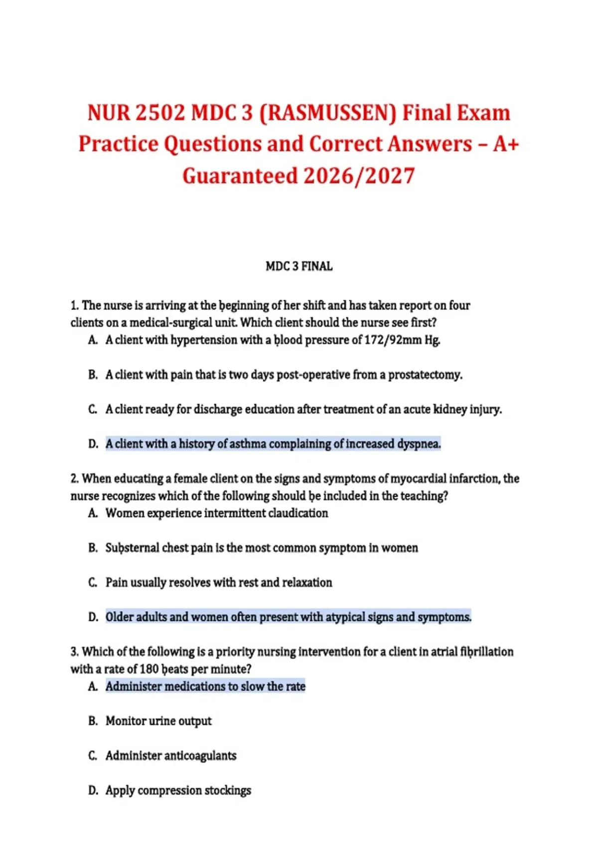 This document contains comprehensive final exam practice questions with correct, verified answers for NUR 2502 Multidimensional Care III (MDC 3) at Rasmussen University. It reviews all major final exam topics, including advanced clinical judgment, prioritization of care, medication management, and nursing interventions for complex patient scenarios, aligned with the 2026/2027 curriculum.